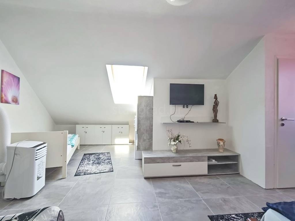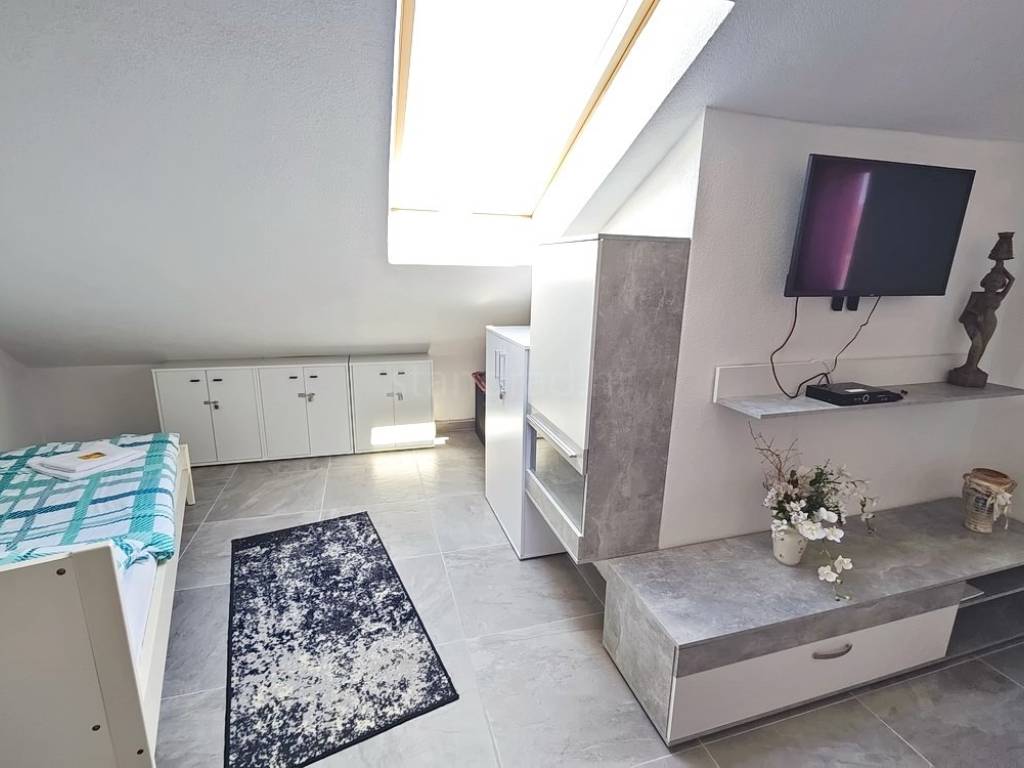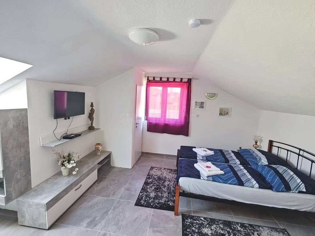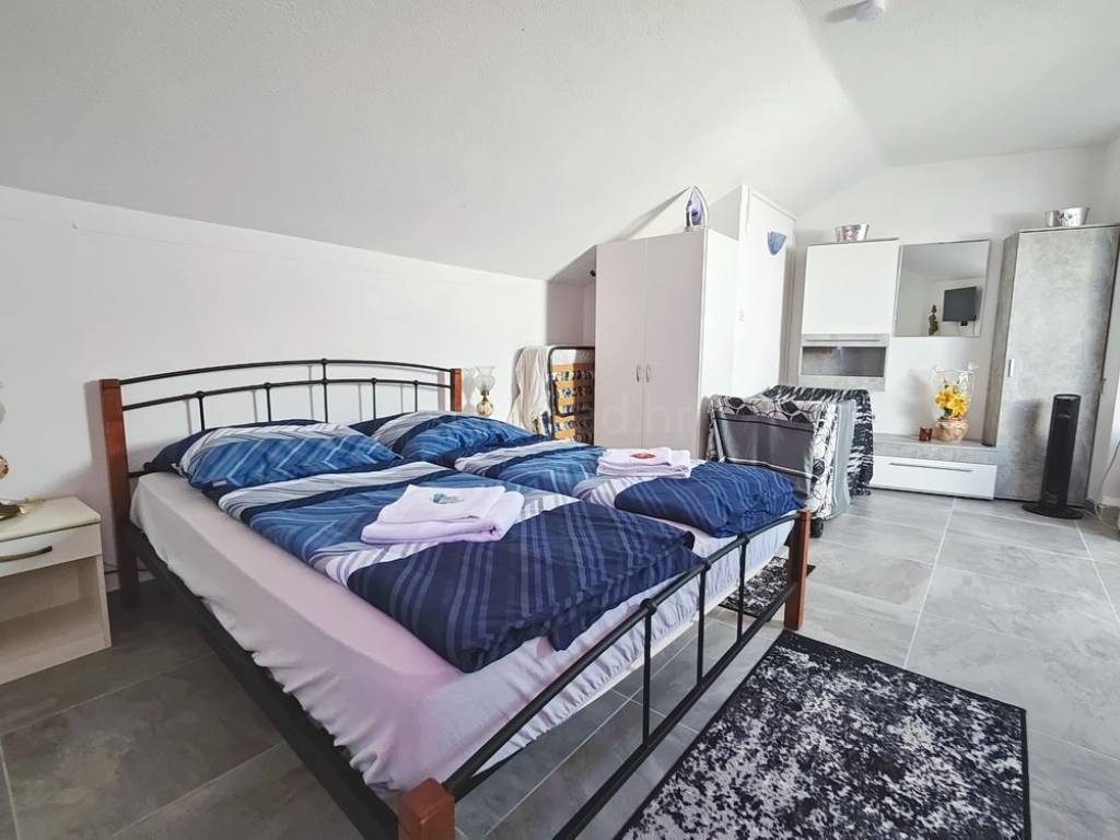 The apartment is positioned in a beautiful, well-built residential building, occupying the second floor and the high attic. The total surface area is 87 square meters, and it consists of a living room connected to a kitchen and dining area, one bedroom, a bathroom, and a spacious terrace with a built-in barbecue. On the upper level, in the attic, there is an additional bedroom. The interior is exceptionally well maintained and fully equipped with quality furniture and technical appliances, making the property immediately move-in ready without any additional investment. The apartment also includes a private storage room located in the building's basement.