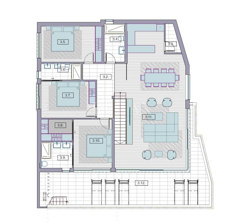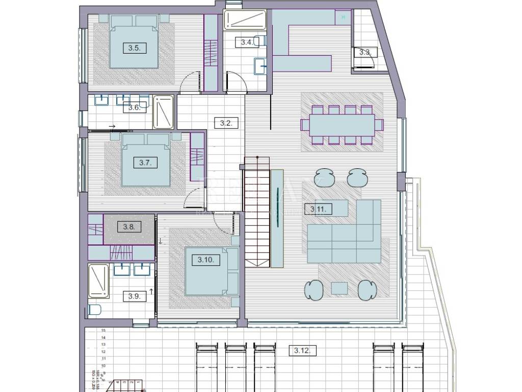 The 166.2 m2 apartment is located on the second floor, it consists of a master bedroom with a walk-in closet and a private bathroom, a hallway, two bedrooms, two bathrooms, a storage room, a large open space kitchen with a dining room and a living room with access to a large a balcony with a beautiful view and from where the stairs lead to the roof terrace of 84 m2 with a swimming pool and sun deck, to which it is possible to add some other content if desired.