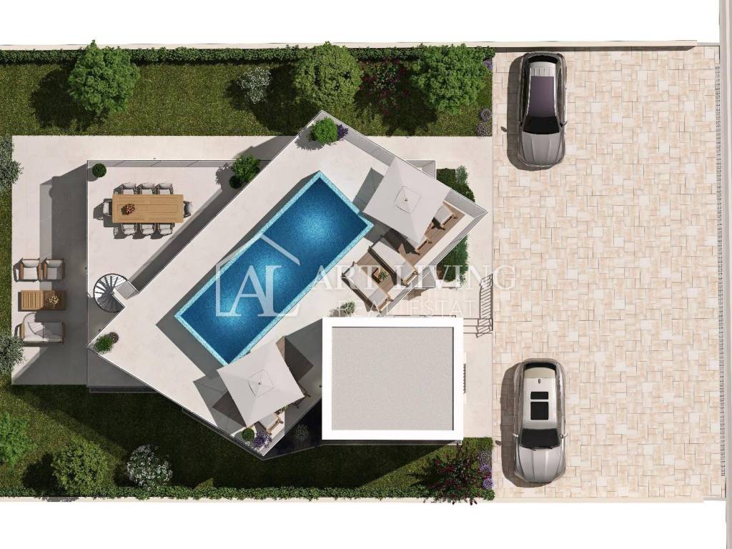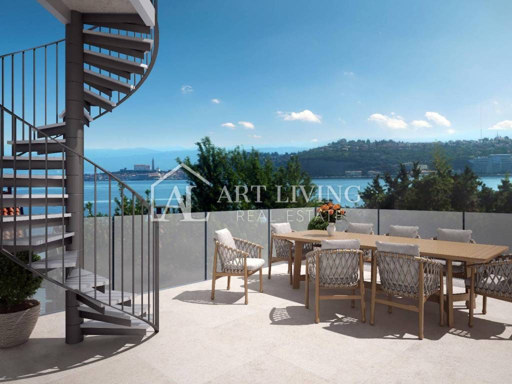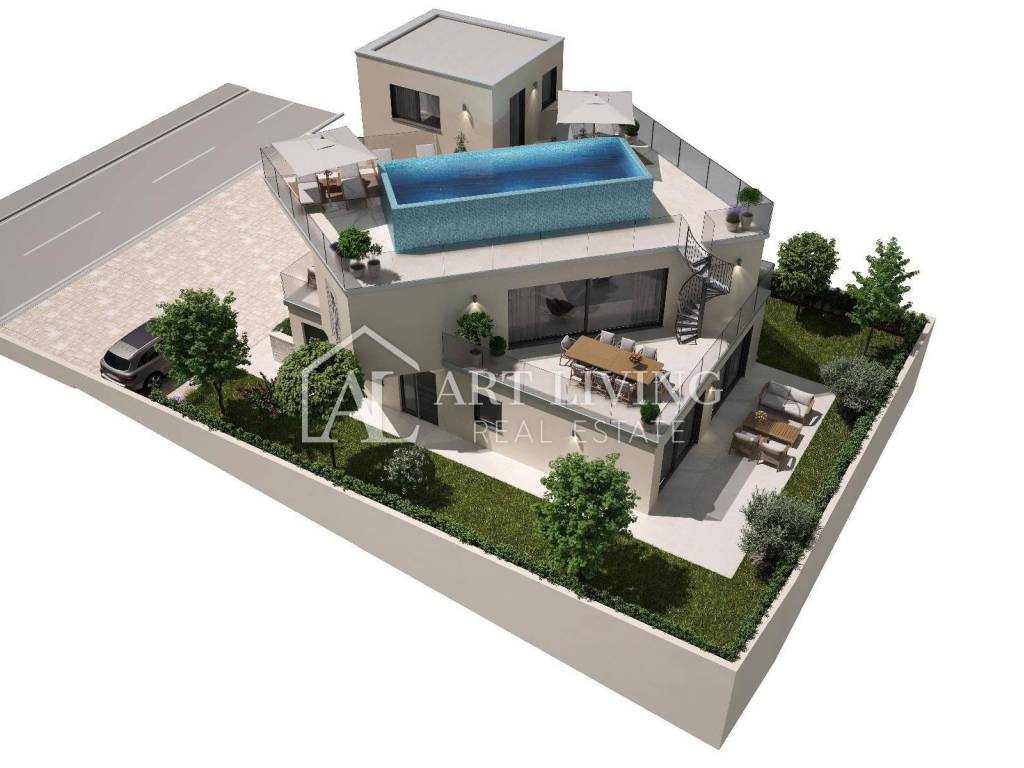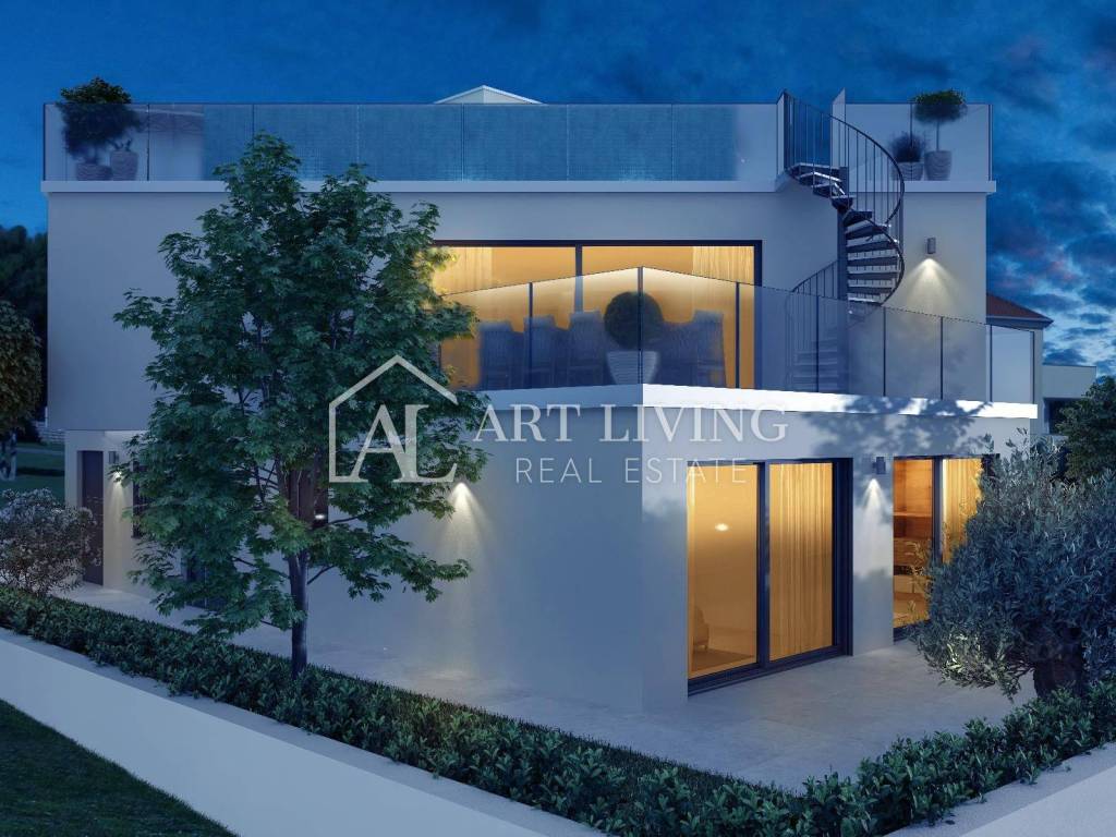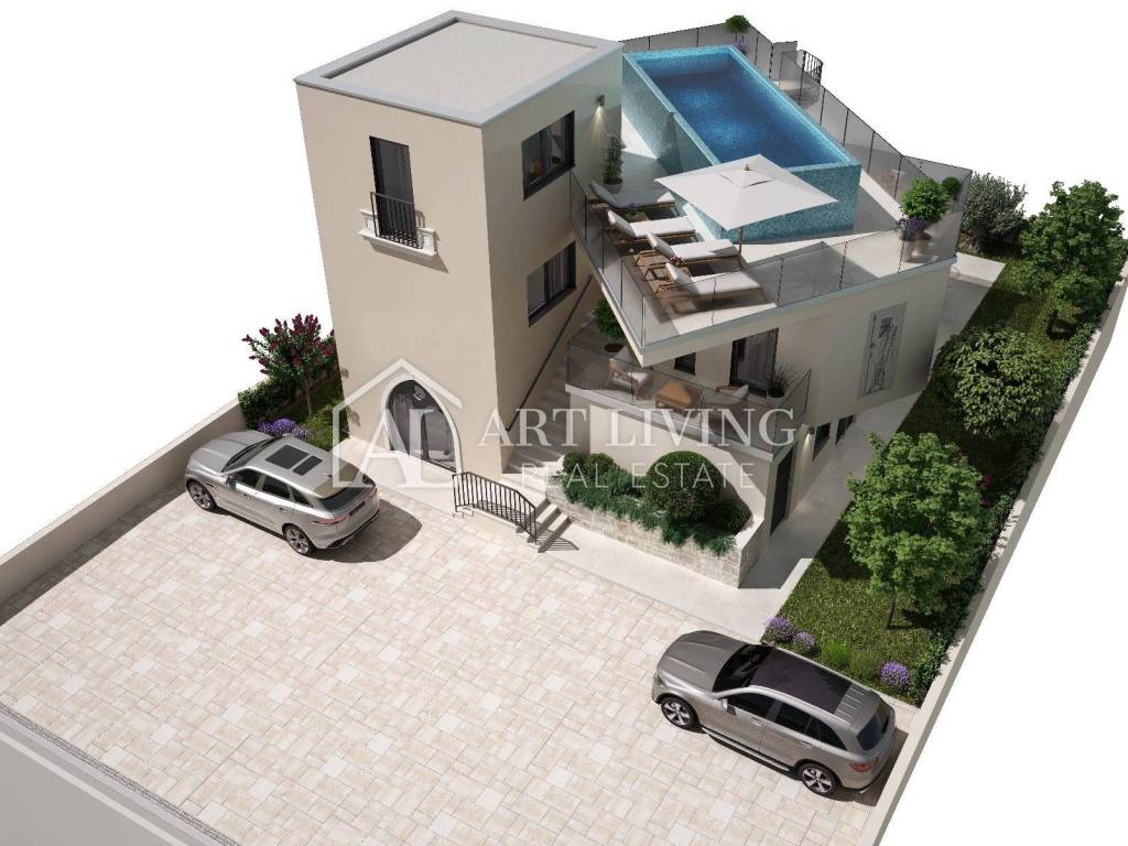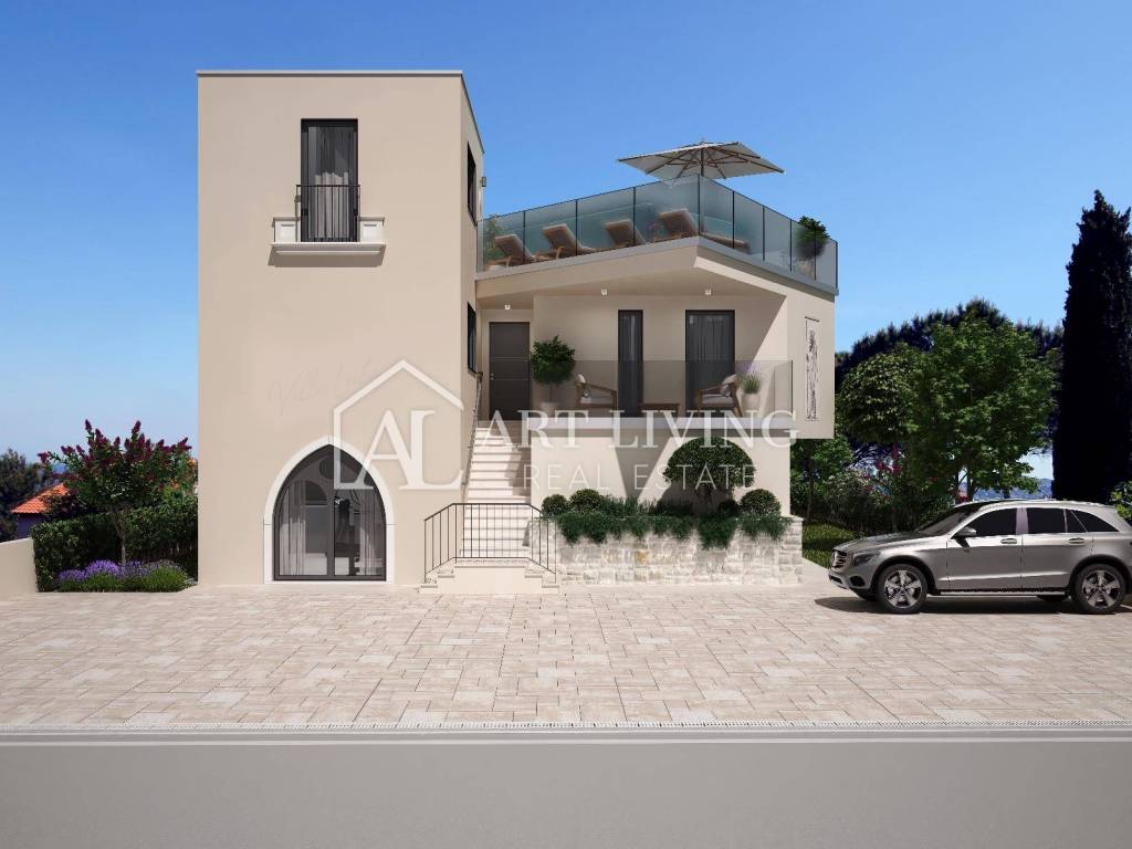 Prodaje se iznimno atraktivno građevinsko zemljište s pogledom na more i Alpe na TOP lokaciji, 100 m od mora i predivne plaže, s gotovim projektom luksuzne moderne vile sa krovnim bazenom.