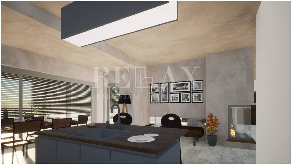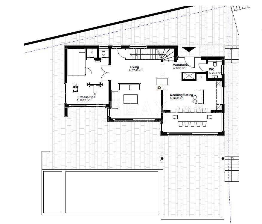 On the first floor there is an entrance hall, a toilet, a room intended for a gym and a sauna with a bathroom, a kitchen with a dining room, a living room with an exit to the terrace where there is a heated swimming pool.