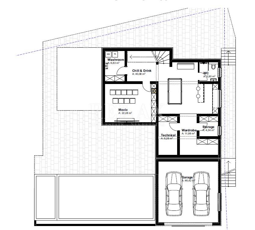 On the ground floor there is a garage for two cars, a storage room, a toilet, a laundry room, and two larger rooms intended for a cinema and a playroom.