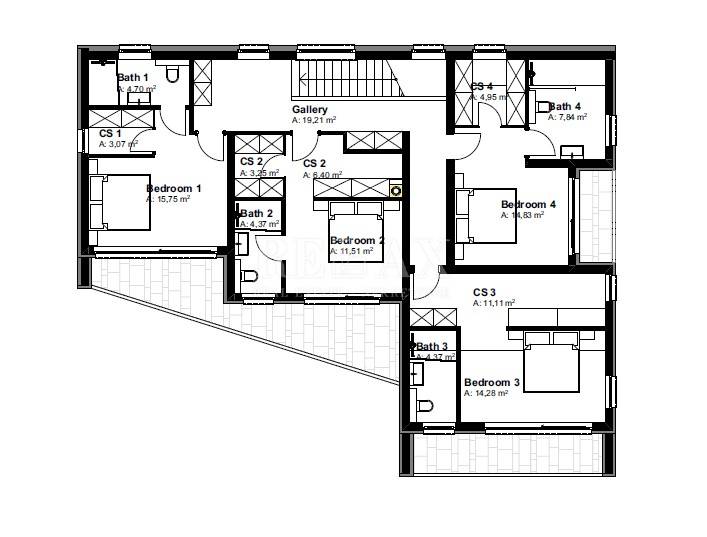The internal staircase leads to the second floor where there are 4 bedrooms, each with its own bathroom and wardrobe.