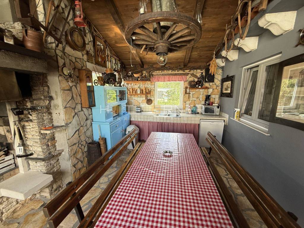 The second house (50 m²) consists of a kitchen with a dining and living area, a bathroom, and two bedrooms. Next to this smaller house, there is a 26 m² tavern with a kitchen, a large fireplace, and a hearth, ideal for gatherings and socializing.