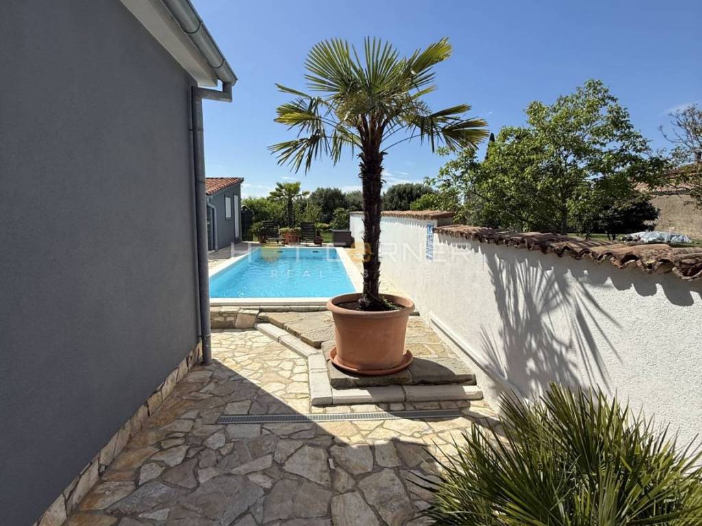 Outdoor area: 32 m² pool with an electrolysis system (saltwater), sunbathing area, outdoor shower, and diverse vegetation (palms, olive trees).