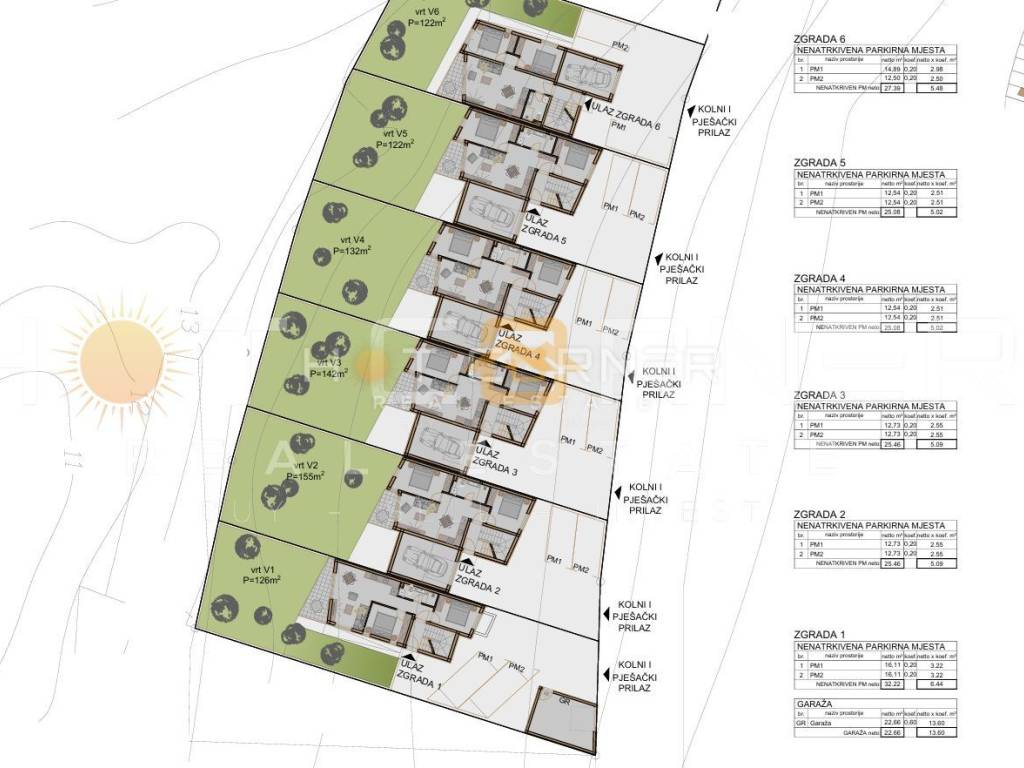 For sale: apartments in a small modern settlement with several small row buildings, each consisting of only 3 units.