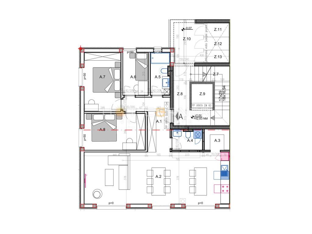 For sale a beautiful apartment in a modern new building near Pula, Veli Vrh - Galižanska cesta area. The apartment is located on the ground floor of a small residential building in a quiet location, with a living area of ​​86.21m2 and consists of 3 bedrooms (11.65m2, 11.23m2, 5.62m2), hallway (8.22m2), living room, dining room and kitchen (39.31m2), bathroom (4.21m2), toilet (3.25) and storage room (2.72m2).