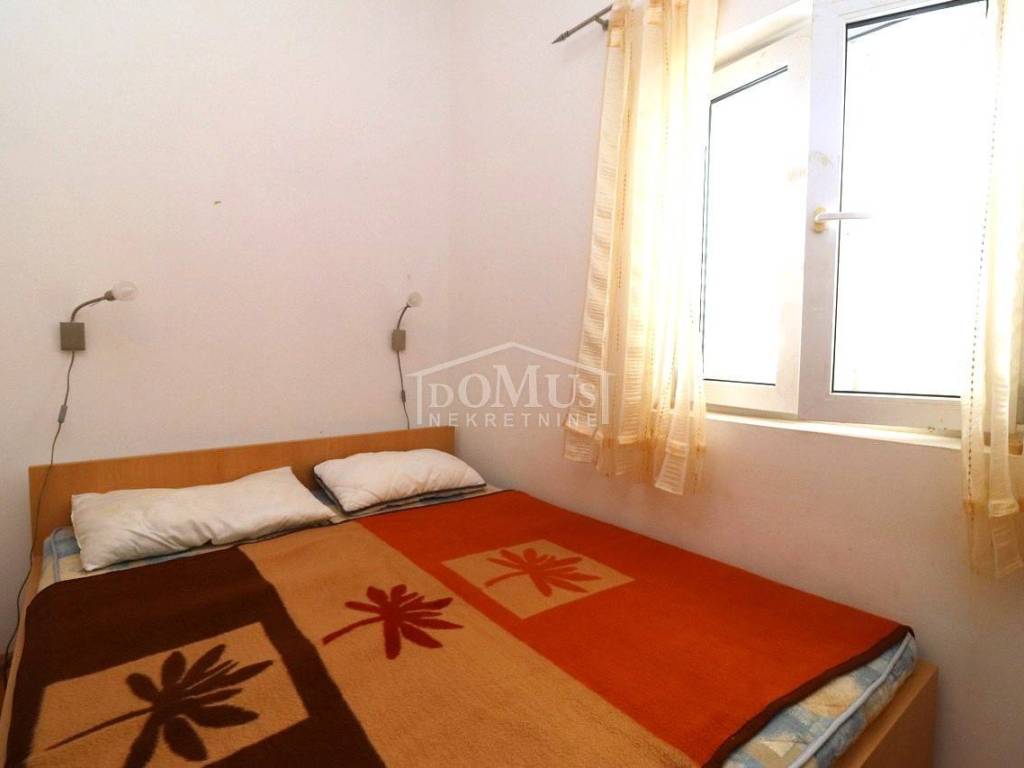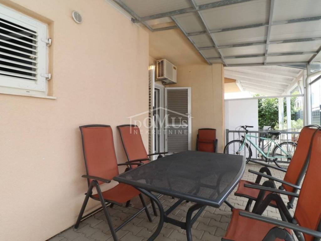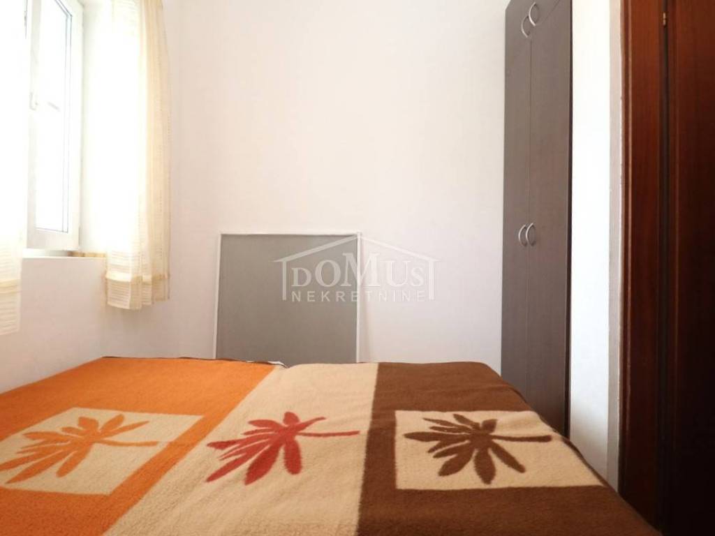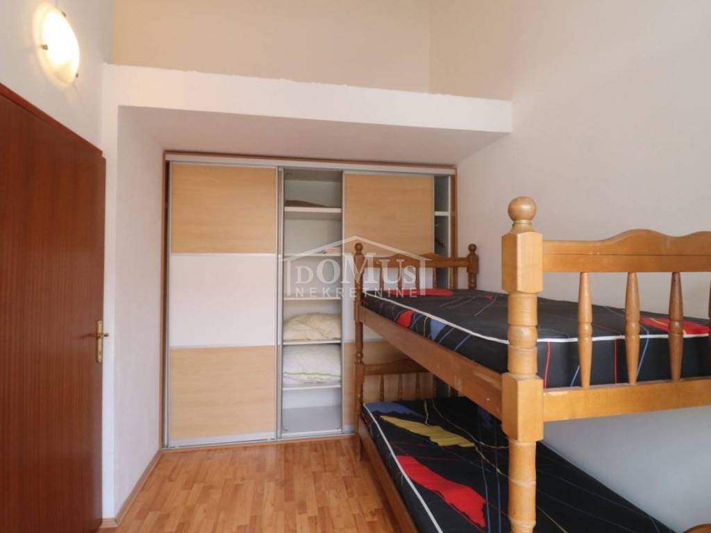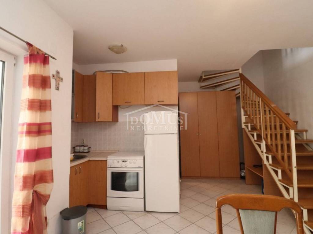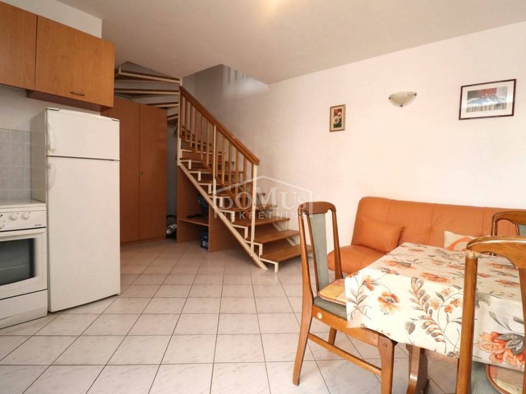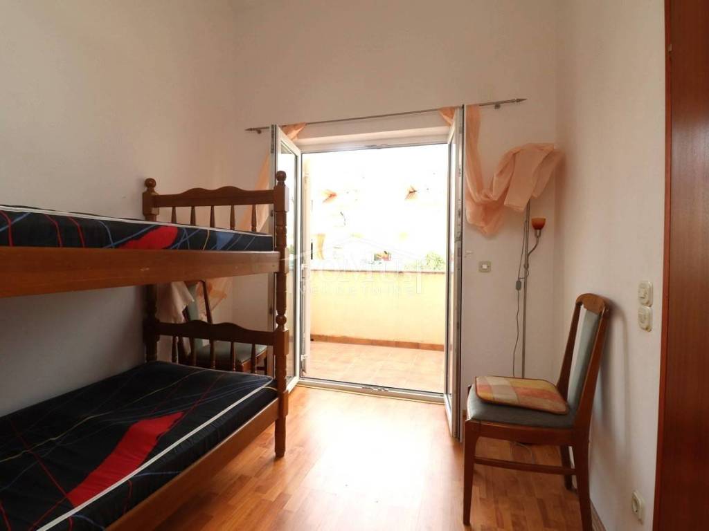 Quiet location in Srima, only 410 m away from the sea / beach, furnished two-story (ground floor + first floor) apartment with a total usable area of 53.70 m2. On the ground floor the apartment consists of a kitchen and living room with access to a covered terrace and a bathroom. Internal stairs lead to the first floor where there is a hallway, toilet, two bedrooms, one of it has an uncovered terrace. The apartment is air-conditioned, fully furnished and included in the price. The apartment has one parking spot. It is only 410m from the beach, and 1500m from the town center.