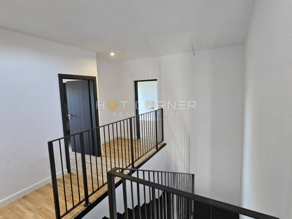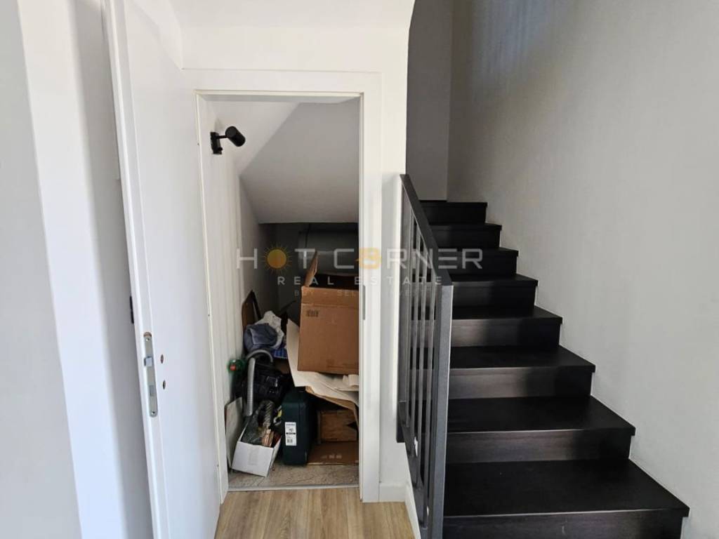 The spacious ground floor features an open-concept living area that seamlessly connects the living room, dining space, and kitchen with a large pantry. Bright interiors and large sliding glass doors create an airy atmosphere and maintain a constant connection with the surrounding nature. From the living room, you step out onto a landscaped garden with a 9 × 4 m swimming pool, a sunbathing area, and a designated space for a future barbecue — ideal for family gatherings and warm summer evenings outdoors. There is also a guest toilet and a practical storage room under the stairs.
