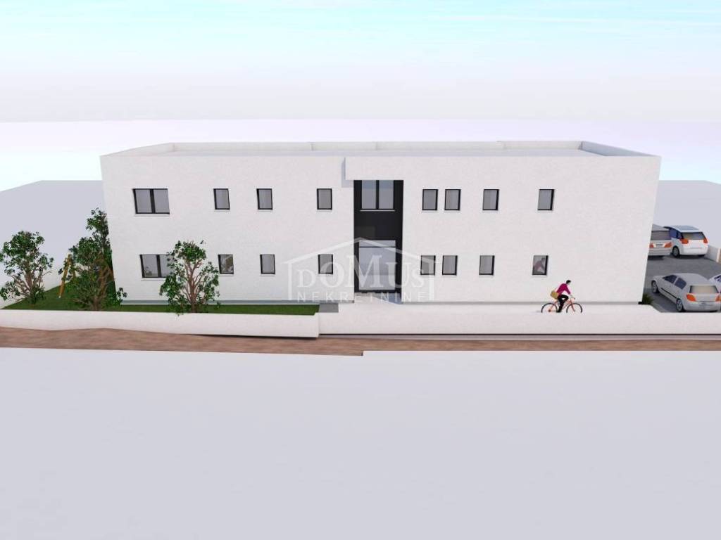 Vodice, new building, apartment on the ground floor of a residential building with a total of four residential units. Apartment S2 is located on the ground floor of the building, oriented to the south, with a total usable area of 74.63 m2. It consists of a hallway, toilet, bathroom, workroom, 2 bedrooms, a large living room with kitchen and dining room and access to a covered terrace and garden of 121.22 m2. The apartment has one outdoor parking space. The property is 1500 m from the beach and 1300 m from the town center. The planned move-in date is summer 2026.