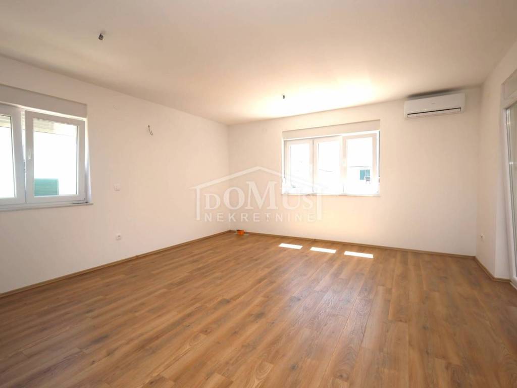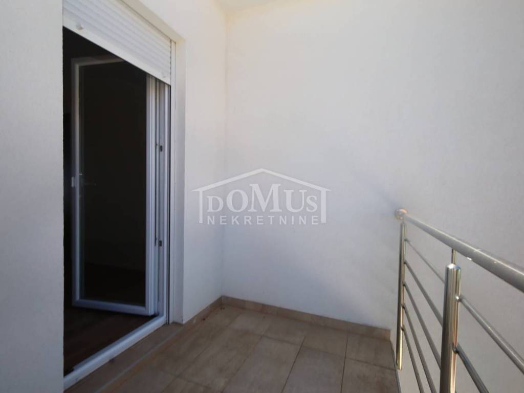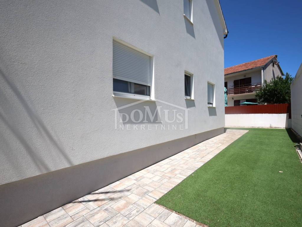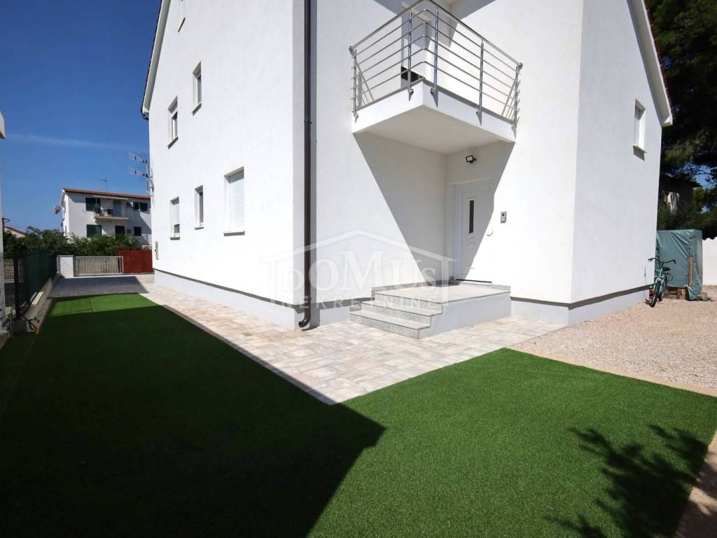 Newly built, in a quiet location, comfortable three-bedroom apartment with a total area of 107.95 m2, on the 1st floor of a small residential building consisting of only two residential units. Each residential unit has a separate entrance on the ground floor. The apartment has a modern design and functional layout, and consists of an entrance and storage room on the ground floor, internal stairs lead to the first floor where there is a hallway, three bedrooms, one of which has a balcony, two bathrooms, a spacious kitchen with a dining area and living room as a whole, from which there is an exit to a covered loggia. Air conditioning in the living room, electric underfloor heating in the bathrooms, PVC joinery, security entrance doors, and high-quality ceramics and sanitary ware. The apartment has a garden-part of the yard of approximately 100 m2, which is fenced and paved, and parking for 2 vehicles. The apartment is located 800 m from the arranged beach, and 1,100 m from the city center.