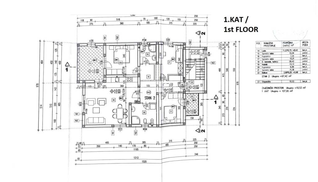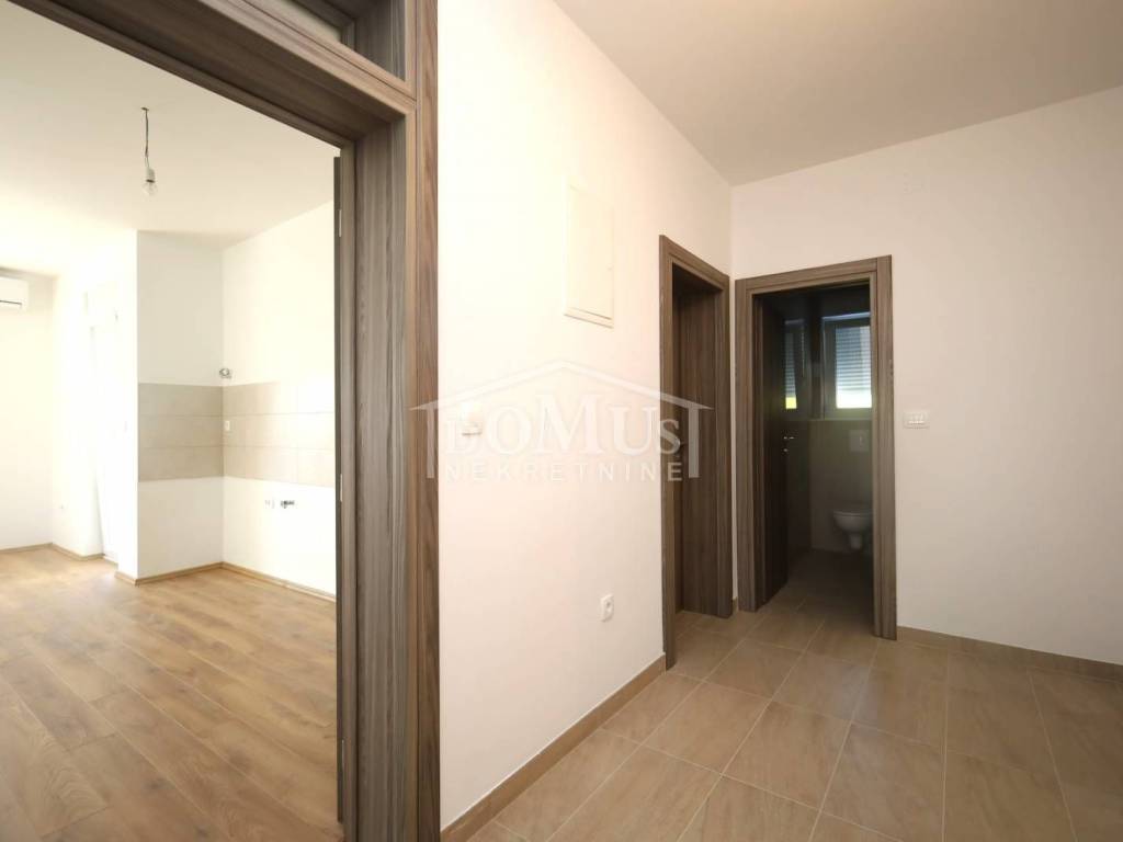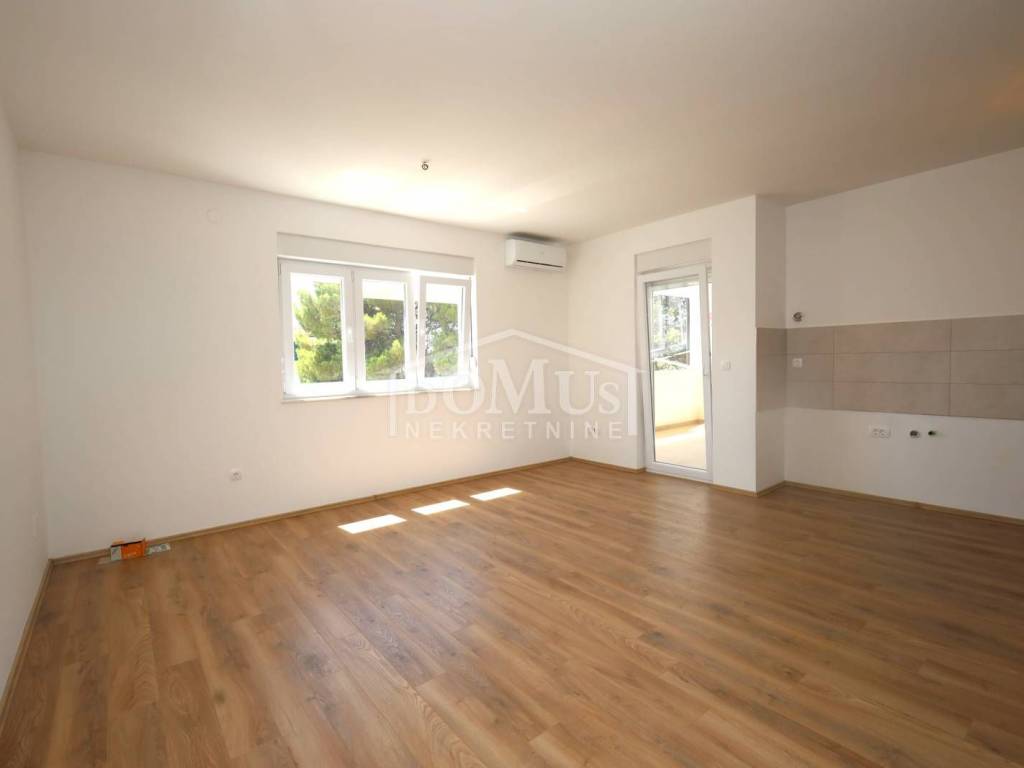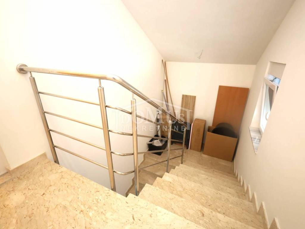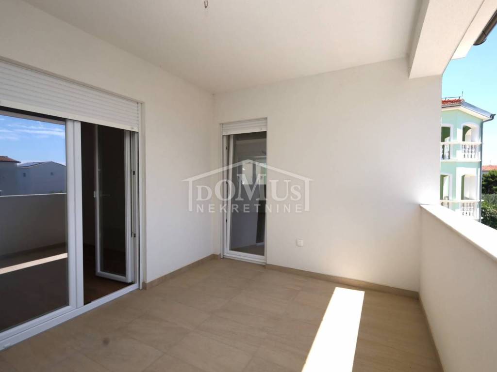 Newly built, in a quiet location, comfortable three-bedroom apartment with a total area of 107.95 m2, on the 1st floor of a small residential building consisting of only two residential units. Each residential unit has a separate entrance on the ground floor. The apartment has a modern design and functional layout, and consists of an entrance and storage room on the ground floor, internal stairs lead to the first floor where there is a hallway, three bedrooms, one of which has a balcony, two bathrooms, a spacious kitchen with a dining area and living room as a whole, from which there is an exit to a covered loggia. Air conditioning in the living room, electric underfloor heating in the bathrooms, PVC joinery, security entrance doors, and high-quality ceramics and sanitary ware. The apartment has a garden-part of the yard of approximately 100 m2, which is fenced and paved, and parking for 2 vehicles. The apartment is located 800 m from the arranged beach, and 1,100 m from the city center.