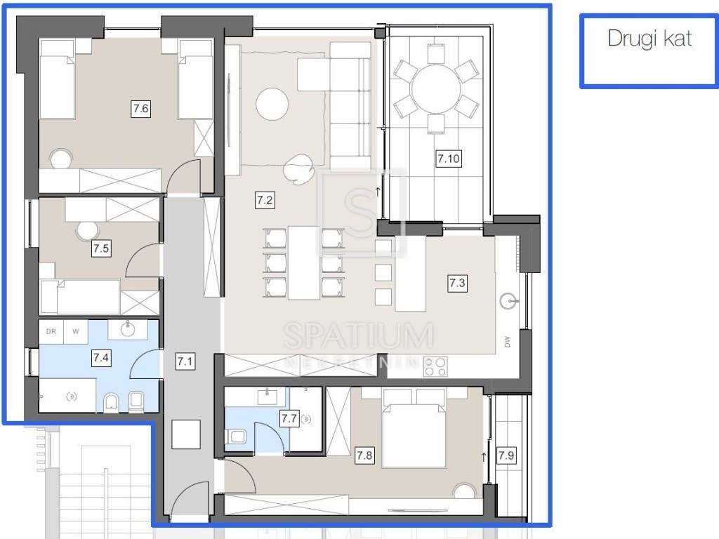 LABIN, we are pleased to present a modern and spacious apartment of 111.67 m², located on the second floor of a high-quality urban villa consisting of a total of three levels. The apartment is carefully designed to provide maximum comfort and functionality and consists of three bedrooms, two bathrooms, a hallway, and an open-concept living space that connects the kitchen, dining area, and living room with access to a covered terrace. Thanks to large glass walls, the space is filled with natural light, creating a pleasant atmosphere throughout the day. Durable and high-quality materials are used, and the project is designed to meet the highest standards of modern living. Planned construction completion is in June 2027, while handover is scheduled for December 2027.