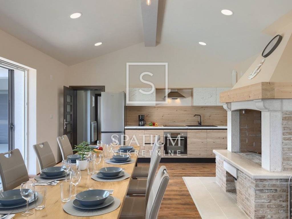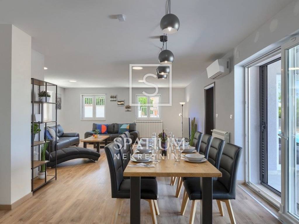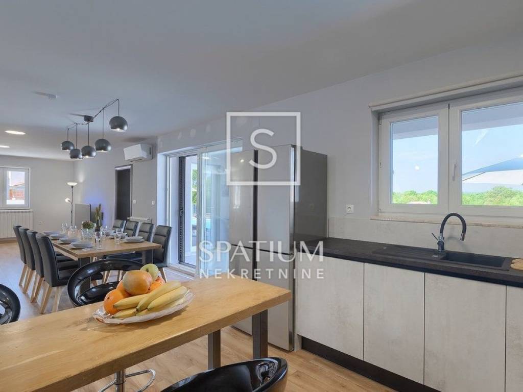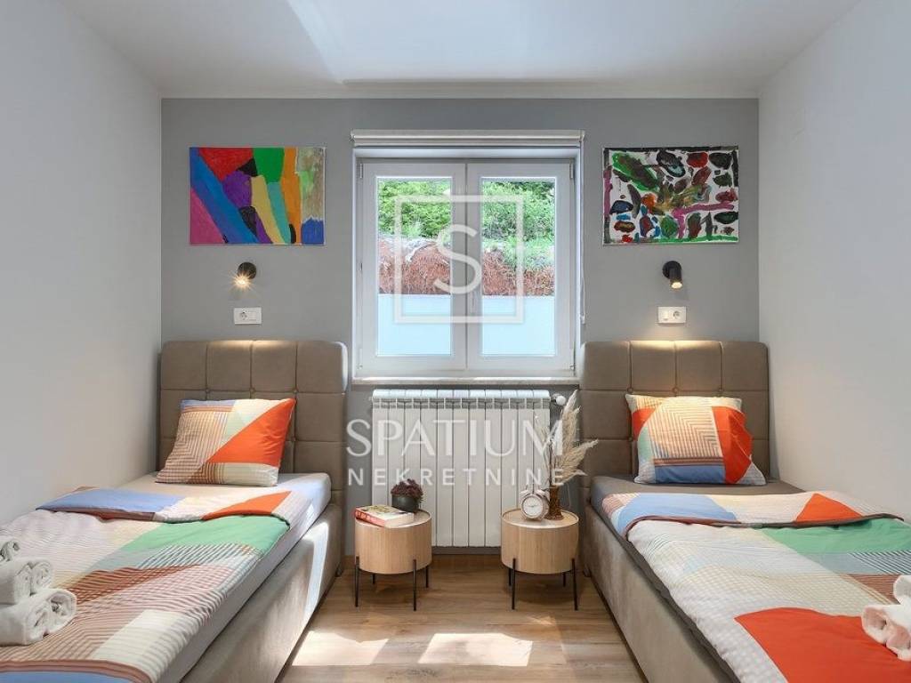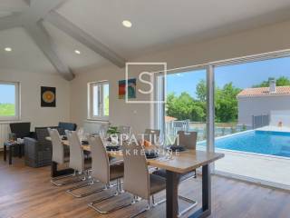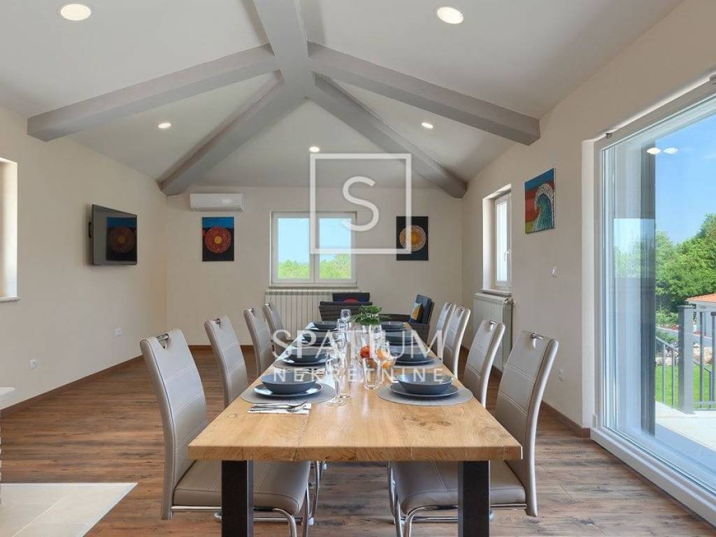 LABIN – SURROUNDINGS, a spacious family home with a total living area of 250 m² is offered for sale, situated on a beautifully landscaped 1,400 m² plot with a garden and swimming pool. The house consists of a ground floor and an upper floor.