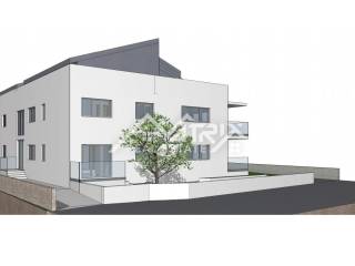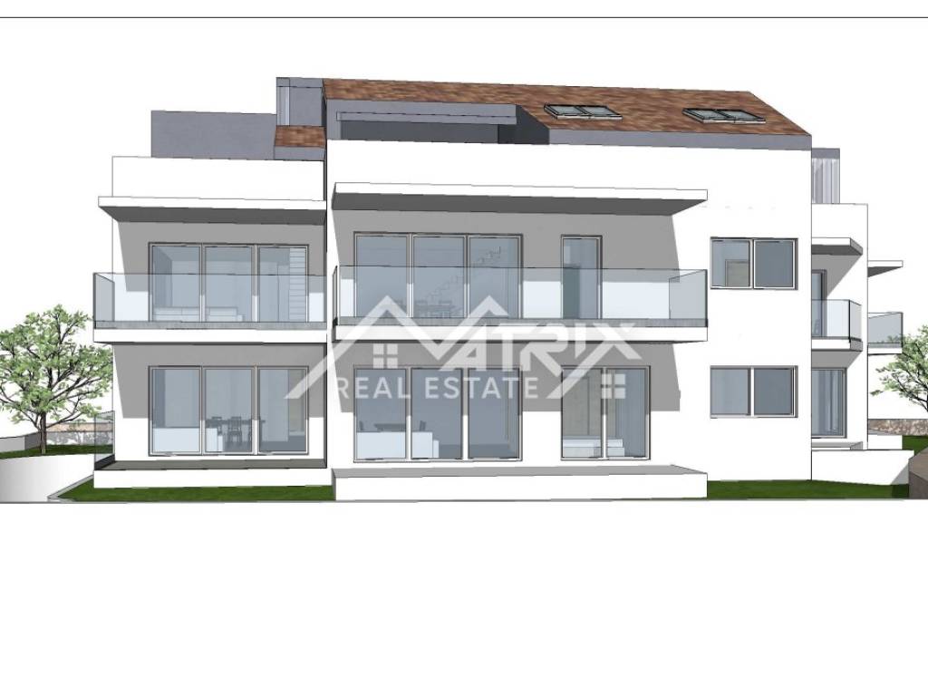 The apartment is equipped with aluminum joinery featuring electric shutters and insect screens, while the walls are constructed with the Knauf system for additional energy efficiency. A video intercom and elegant glass balcony railings further emphasize the modern style of the building. The apartment also includes two parking spaces in the garage, a storage unit, and a garden according to the project, while an elevator connects the garage to the first floor. The price of the apartment includes VAT, meaning the buyer does not pay additional property transfer tax.
