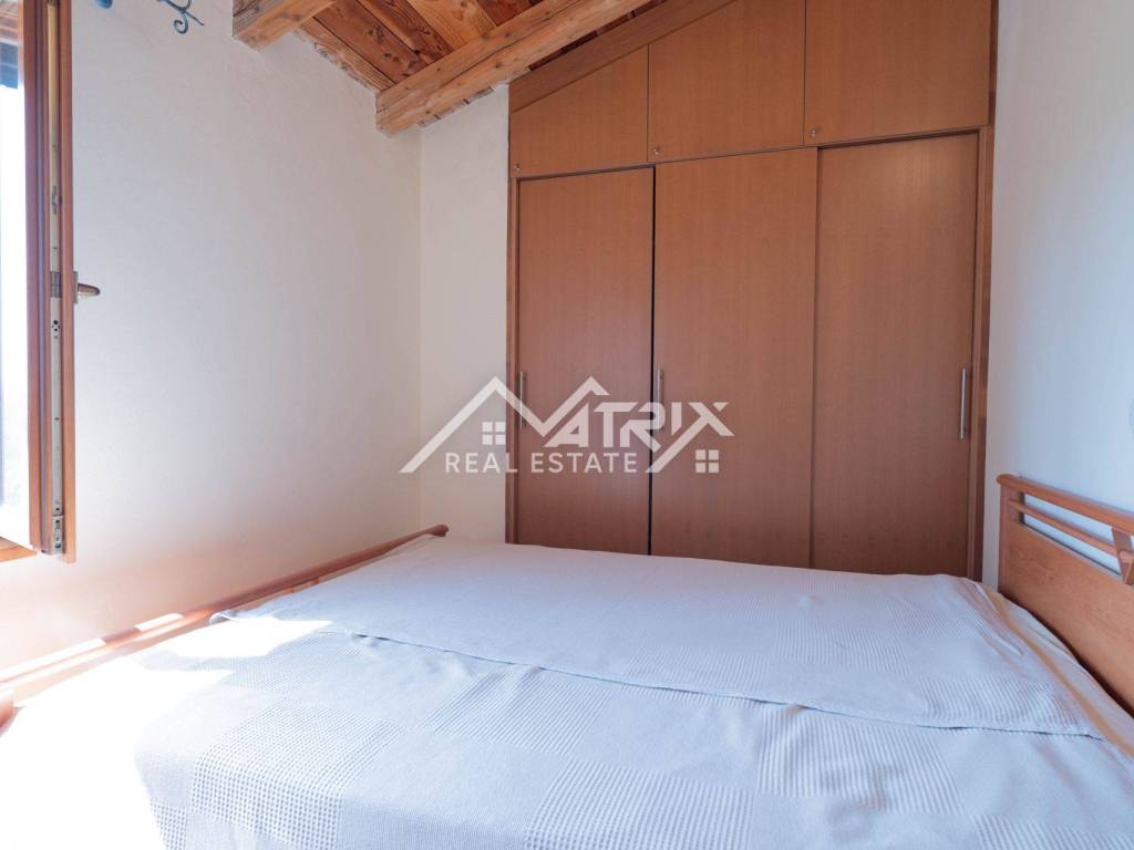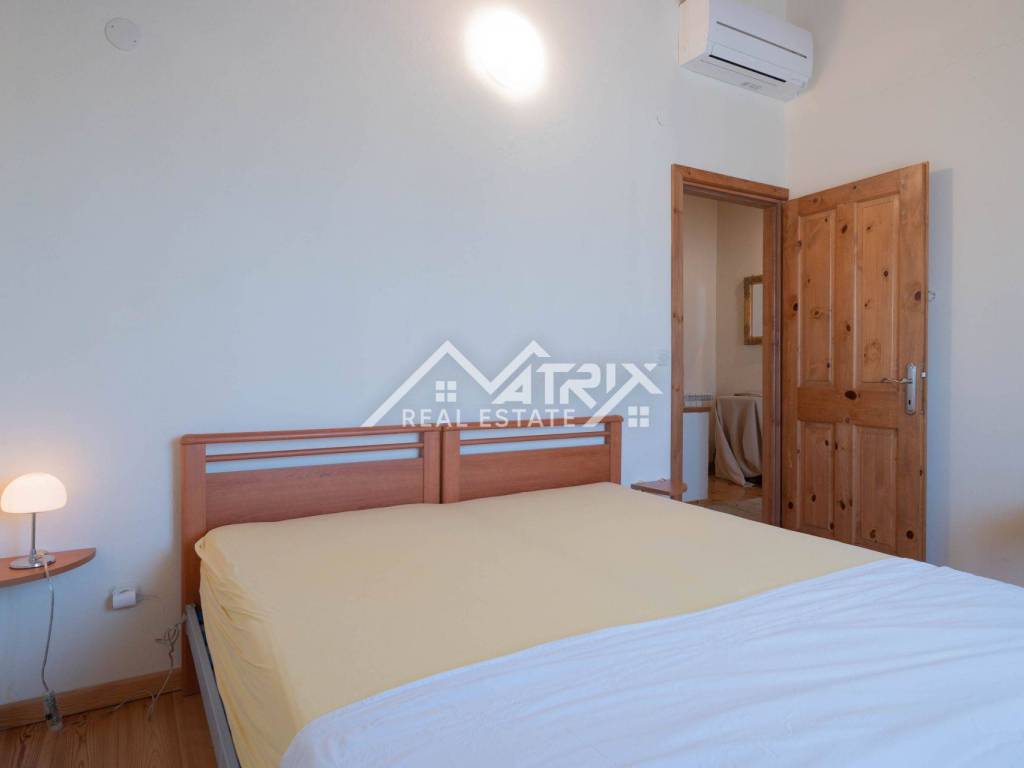 Upstairs, there are two spacious bedrooms, one smaller room that can be used as an office, a child’s room, or extra storage, and a bathroom with a shower. The house has been fitted with new PVC windows and insect screens. Heating is provided via the fireplace on the ground floor and air conditioning on the upper level, making the house comfortable in all seasons.