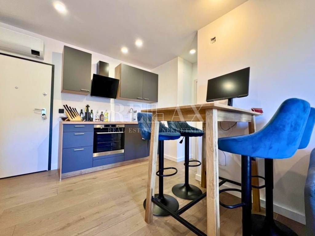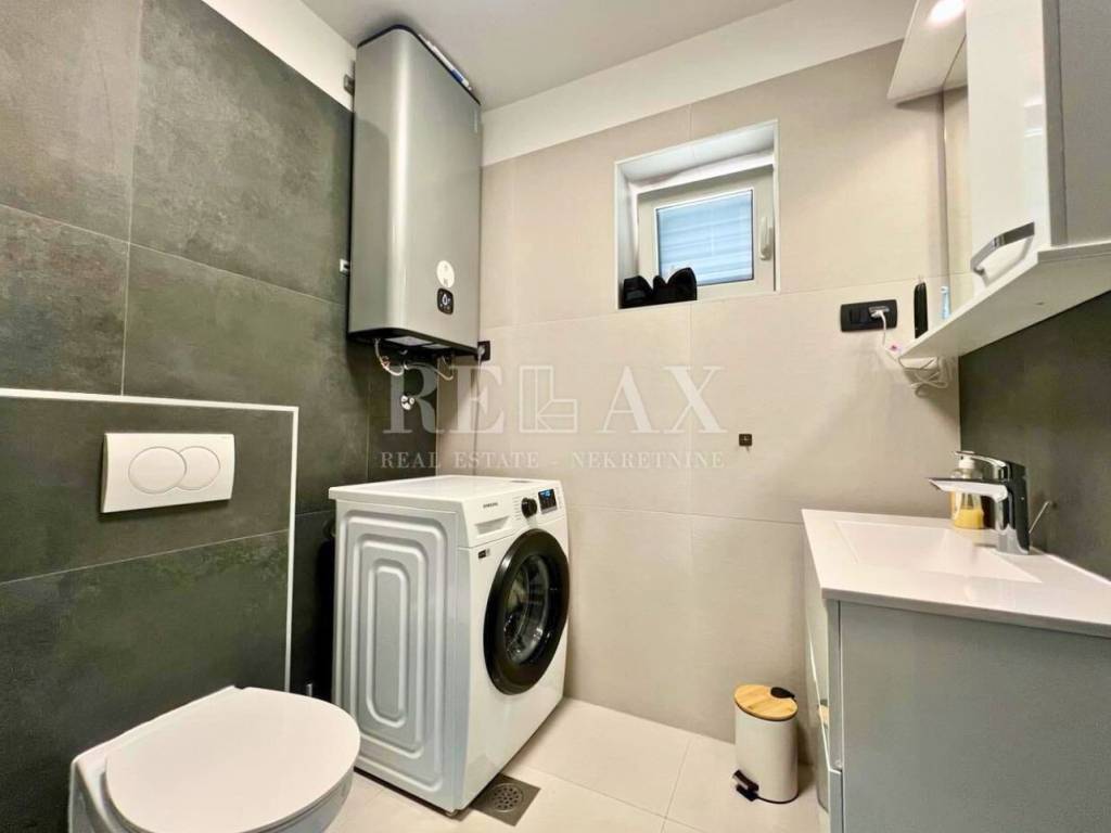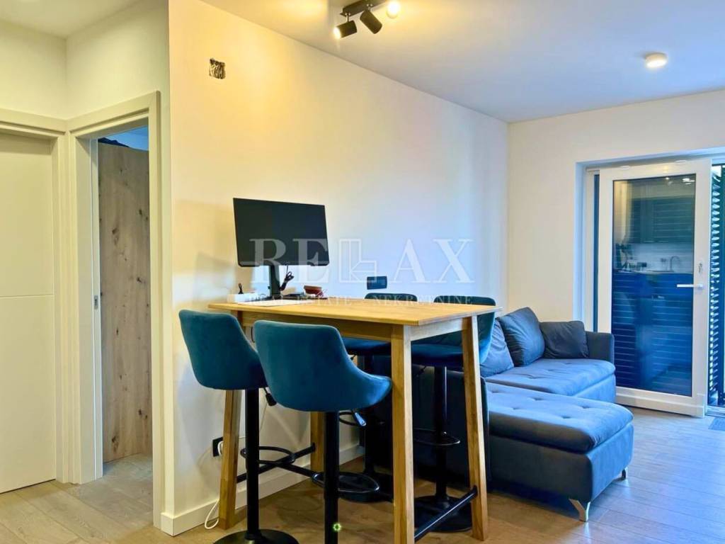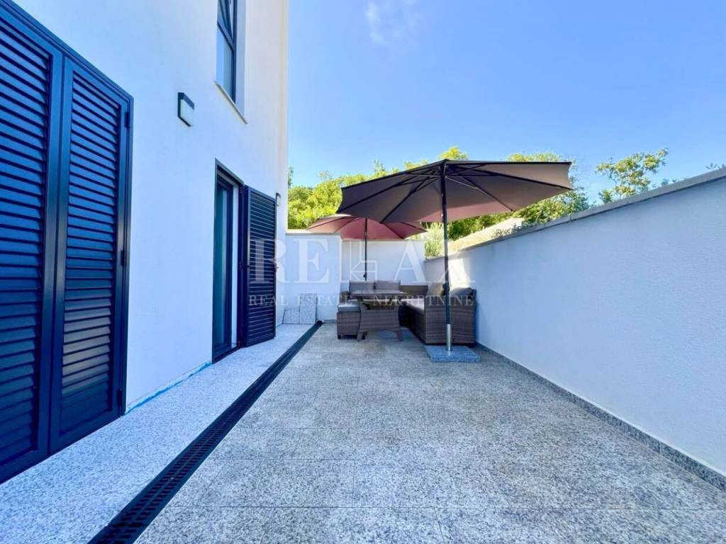 A fully furnished apartment on the ground floor of a newly built residence from 2023 is for sale, located in a quiet area of Ičići, just 1.8 km on foot from the sea and 1.5 km from the town center. The apartment has a total area of 54.26 m², consisting of 32.01 m² of indoor space and a spacious uncovered terrace of 22.25 m² with a sea view.