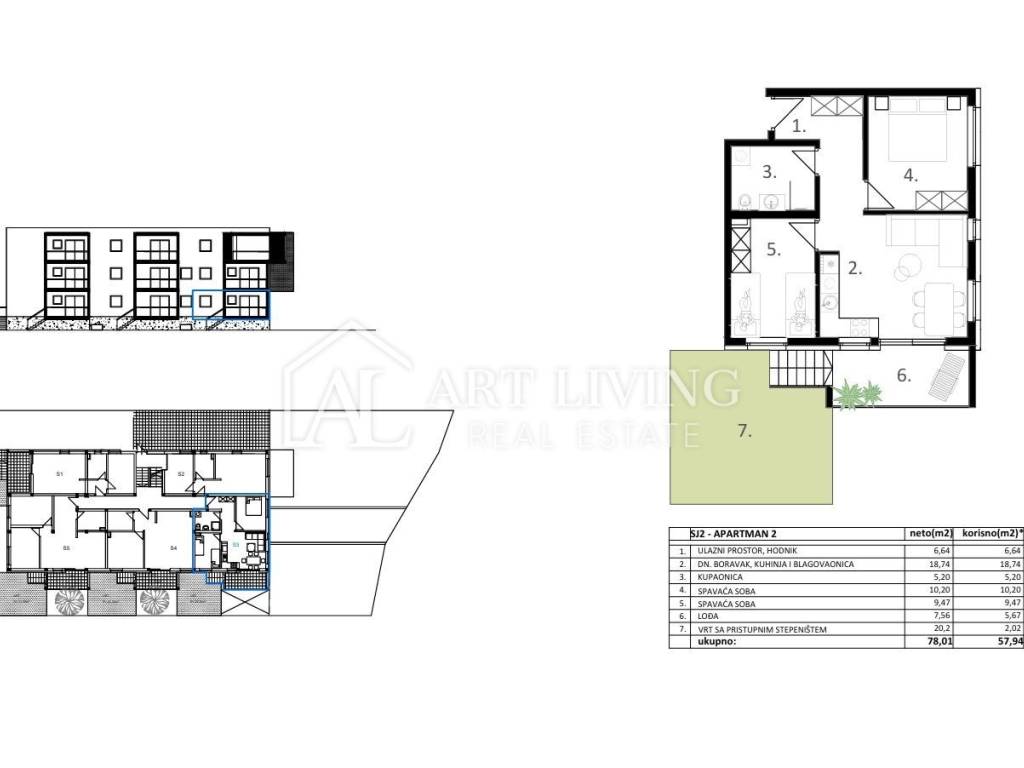 Apartment SJ2, with a total net living area of 55.92 m², is located on the ground floor of the residential and commercial building. It consists of an entrance hall, living room with kitchen and dining area, two bedrooms, a bathroom, and a loggia of 7.56 m².