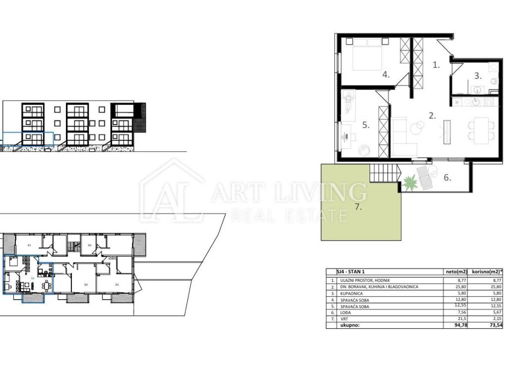 Apartment SJ4, with a total net living area of 71.39 m², is located on the ground floor of the residential and commercial building. It consists of an entrance hall, a living room with kitchen and dining area, two bedrooms, a bathroom, and a loggia of 7.56 m².