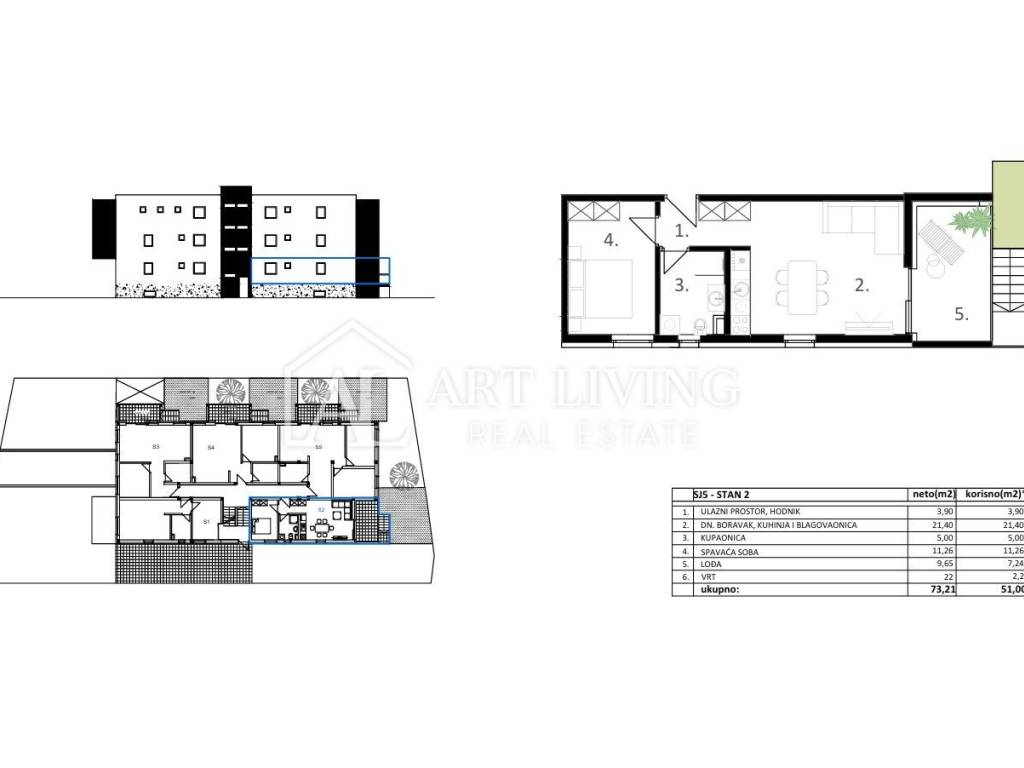 Apartment SJ5, with a total net living area of 48.80 m², is located on the ground floor of the residential and commercial building. It consists of an entrance hall, a living room with kitchen and dining area, a bedroom, a bathroom, and a loggia of 9.65 m².