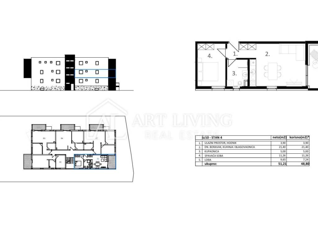 Apartment SJ10, with a total net living area of 48.80 m², is located on the first floor of the residential-commercial building. It consists of an entrance area, living room with kitchen and dining area, one bedroom, bathroom, and a loggia of 9.65 m².
