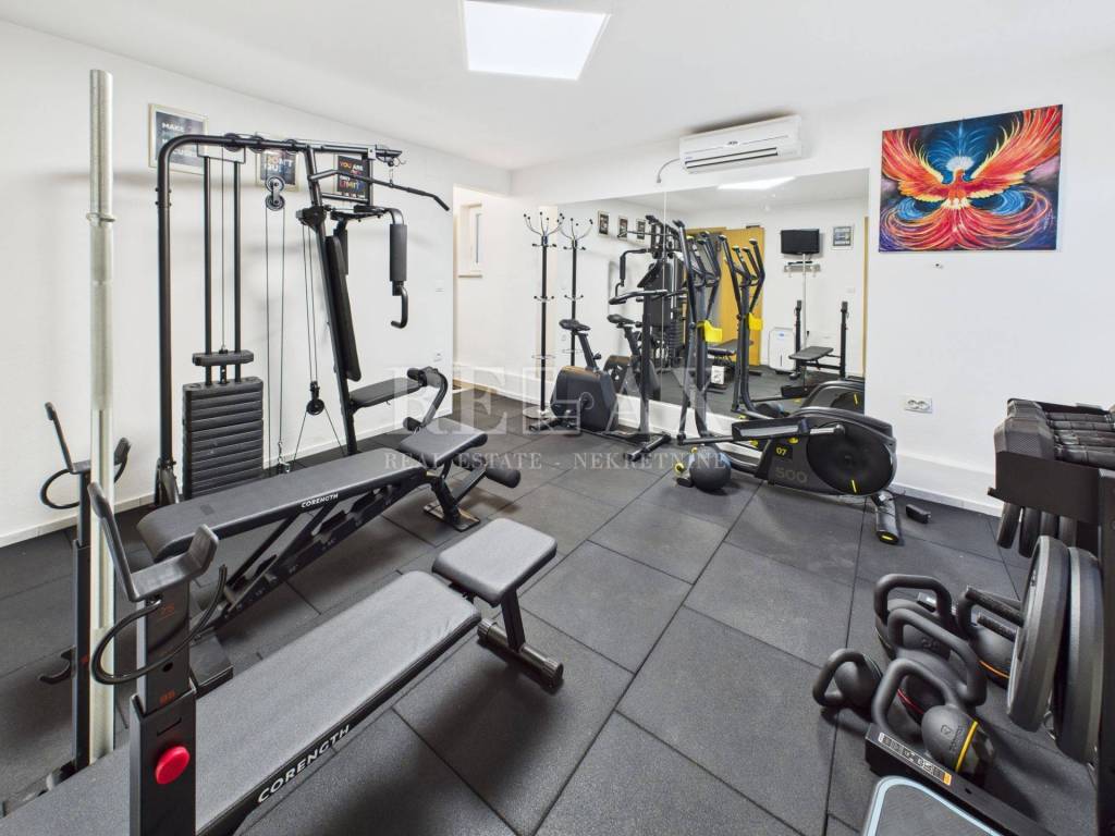 The ground floor features a fully equipped gym, a social area with a pool table, a kitchenette, a bathroom, and a boiler room. On the first floor, there is an open-concept living room connected to the kitchen and dining area, an additional bathroom, and a study nook in the hallway under elegantly crafted, handmade spiral stairs leading to the second floor.