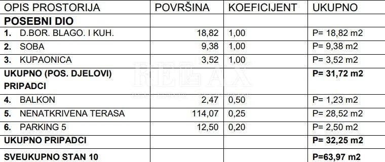 The apartment has a total area of 63.97 m², consisting of a living space of 31.72 m² which includes an open-concept living room with kitchen and dining area, one bedroom, and a bathroom. From the living area, there is access to a balcony, while an uncovered terrace of 28.52 m² adds special value – perfect for enjoying the outdoors.