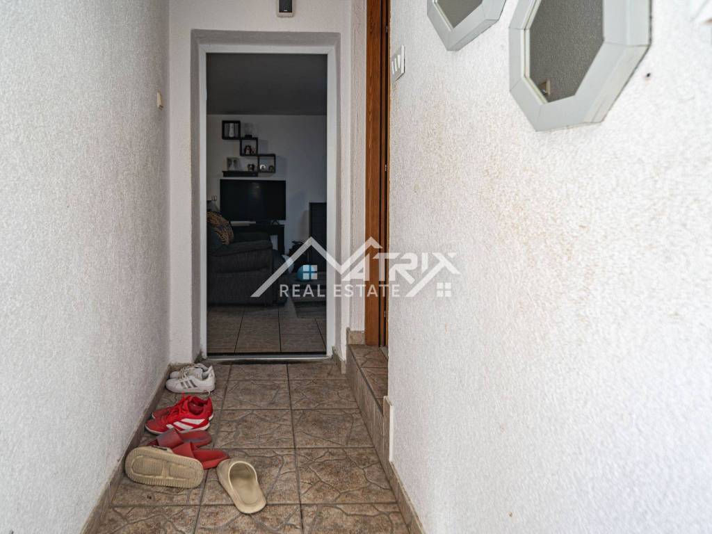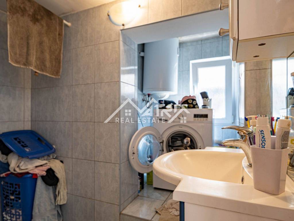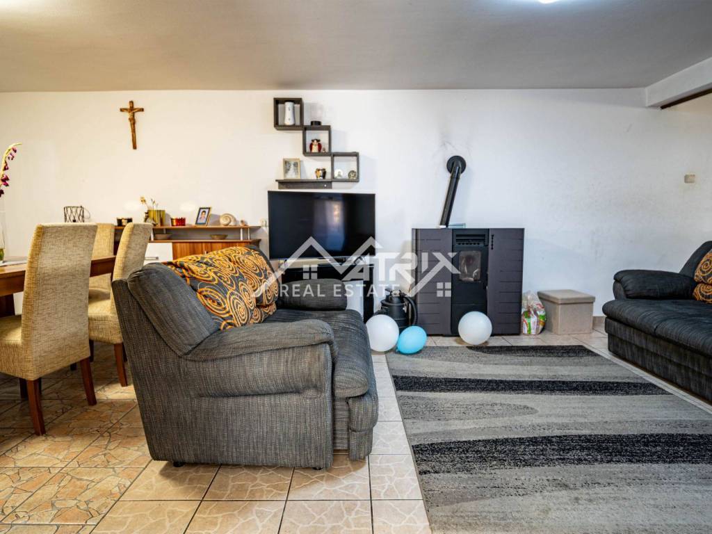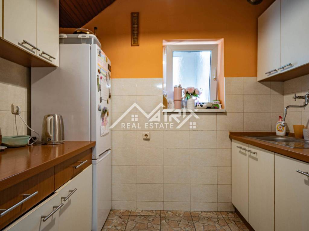 A practical ground-floor apartment in a smaller residential building is available for sale – perfect for families or as a long-term rental investment. The apartment includes an entrance hall, bathroom with natural light, two children's bedrooms, a living room with dining area, a smaller bedroom, and a separate kitchen with a window. Heating is provided by a pellet stove, ensuring low energy consumption throughout the year.