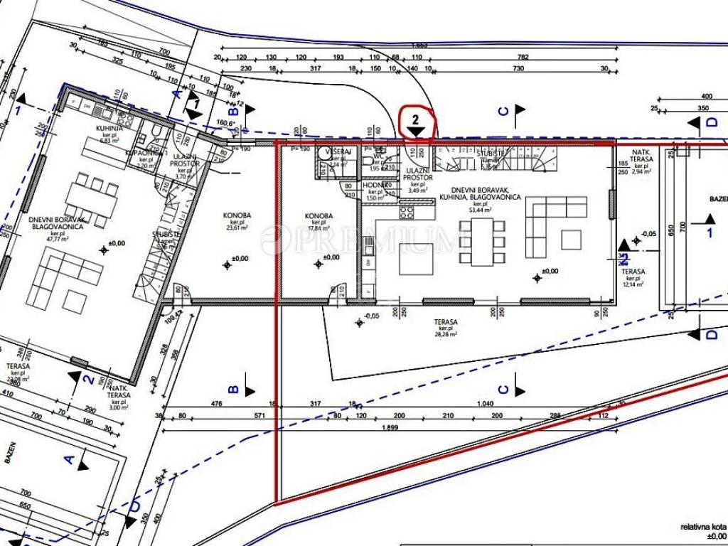 On the ground floor, there is a tavern with a laundry room, entrance hall, toilet, spacious, open space living room with kitchen and dining room, with access to the terrace (40 m2) and a garden with a swimming pool (22.75 m2) and barbecue.