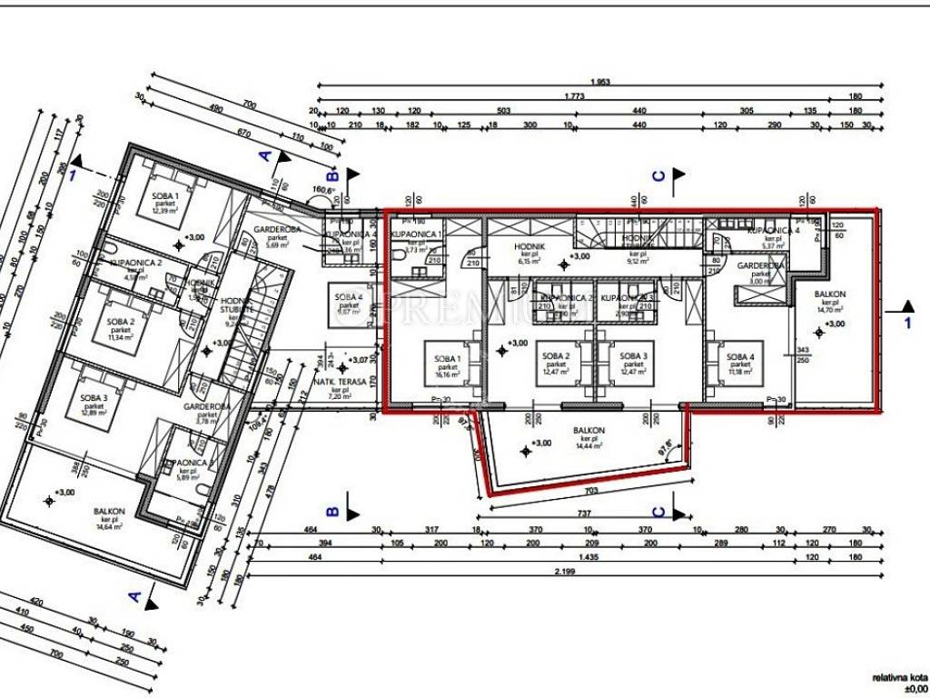 The first floor consists of a hallway, four bedrooms, each with its own bathroom, of which three bedrooms have access to balconies.
