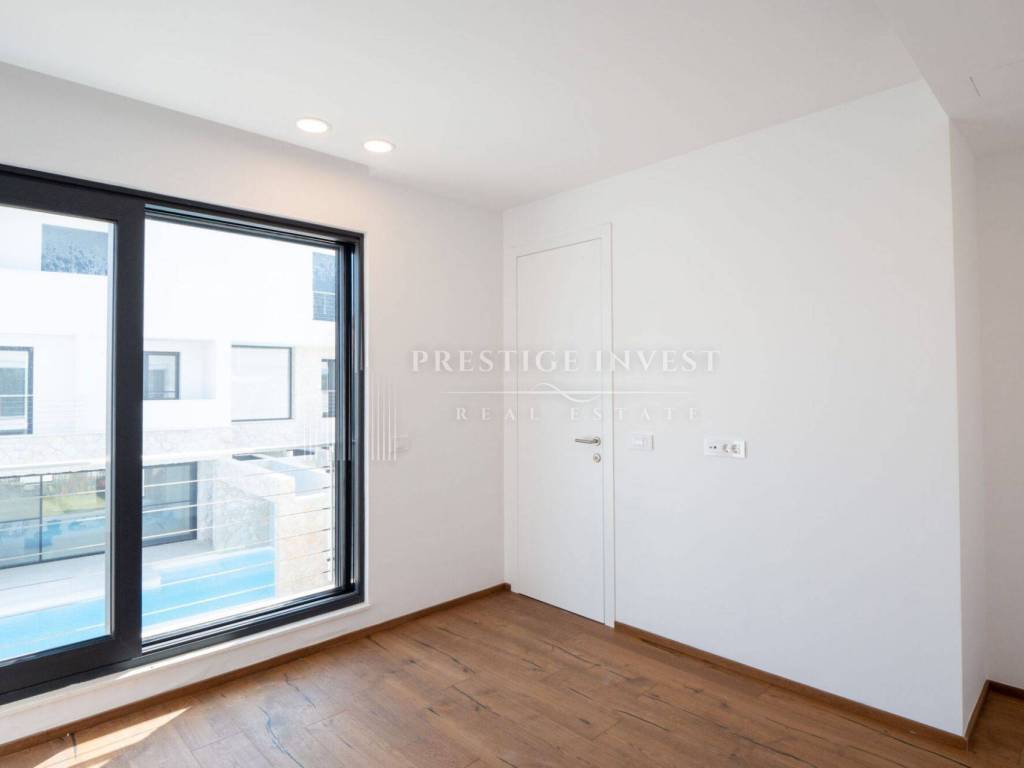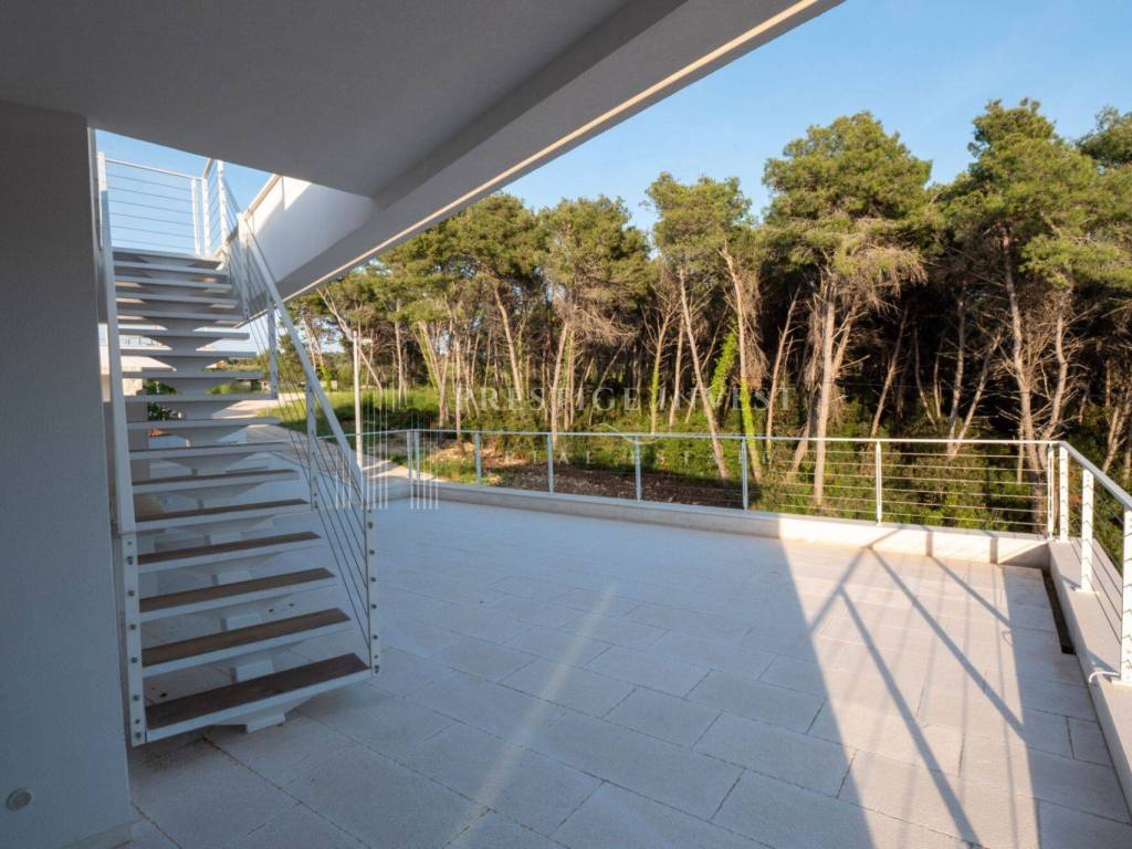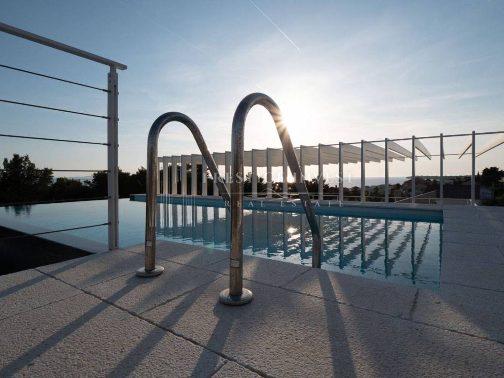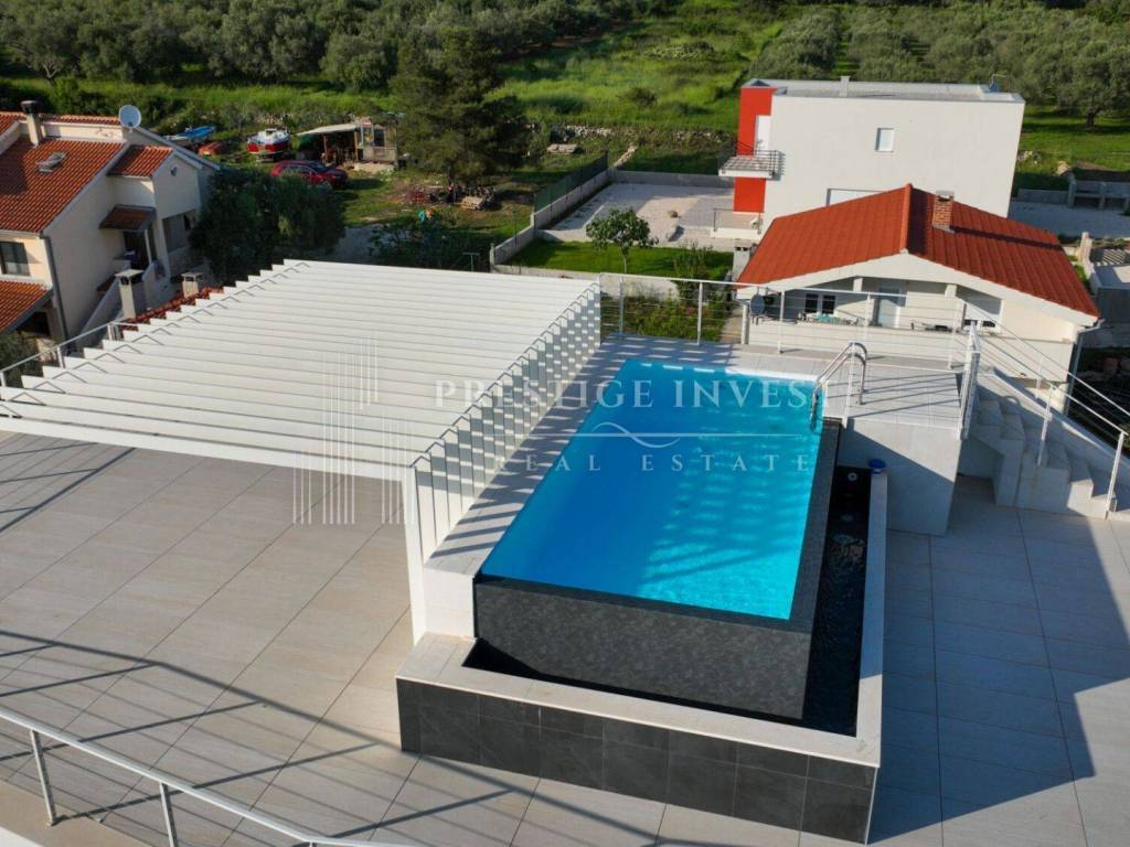 On the first floor there is only an entrance with a hallway and space for built-in wardrobes, a shoe rack or other storage space and a staircase to the second floor. There are four bedrooms with space for a double bed, each bedroom has a separate shower and toilet, and a large shared living room with a kitchen and storage room. A large HS portal connects the living area with the first terrace with a summer kitchen with a barbecue and a sink. External stairs lead to the last, third floor of the apartment with a roof terrace with shaded slats and a swimming pool, next to which there is a technical room with filtration and pool control. High-quality DerFall pool liner.