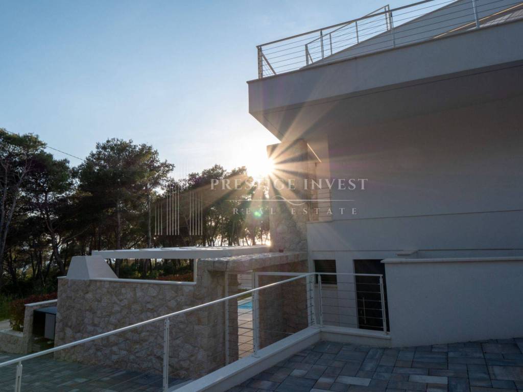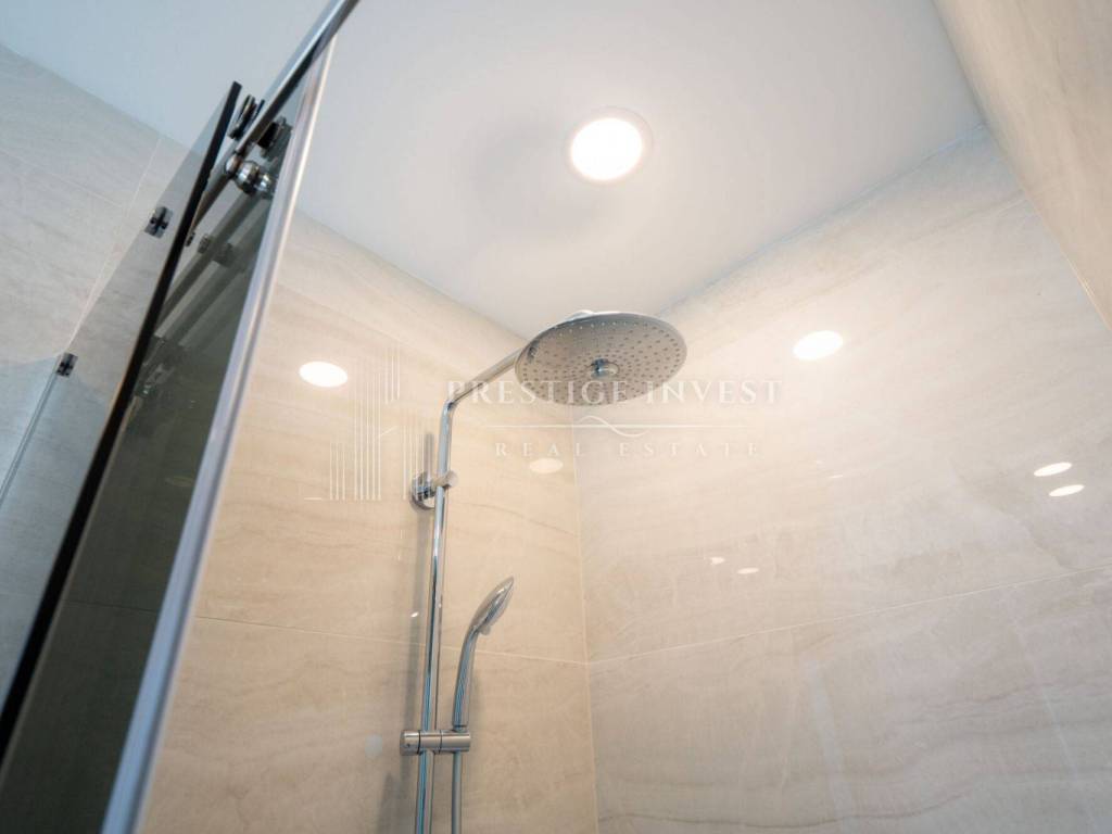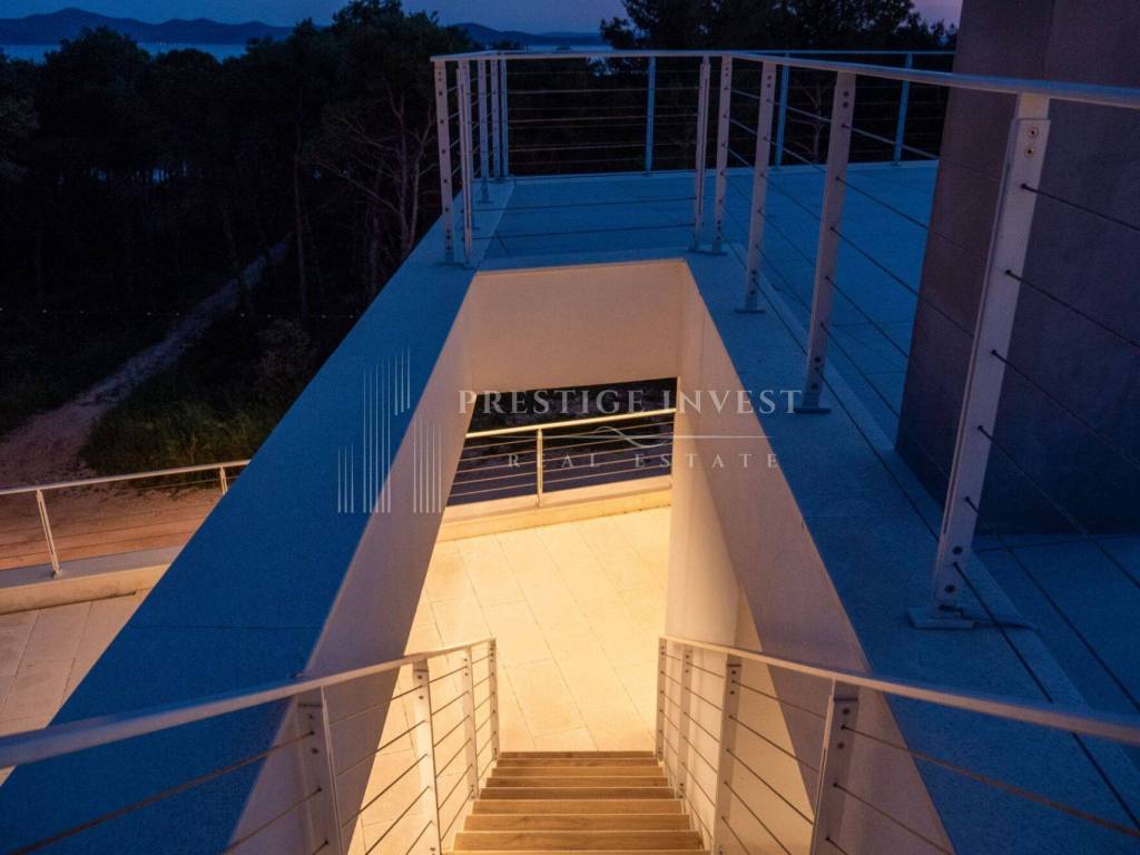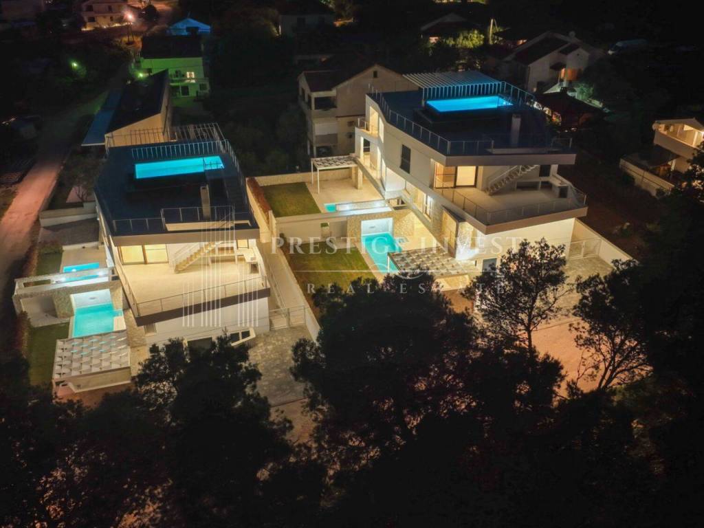 On the first floor there is only an entrance with a hallway and space for built-in wardrobes, a shoe rack or other storage space and a staircase to the second floor. There are four bedrooms with space for a double bed, each bedroom has a separate shower and toilet, and a large shared living room with a kitchen and storage room. A large HS portal connects the living area with the first terrace with a summer kitchen with a barbecue and a sink. External stairs lead to the last, third floor of the apartment with a roof terrace with shaded slats and a swimming pool, next to which there is a technical room with filtration and pool control. High-quality DerFall pool liner.