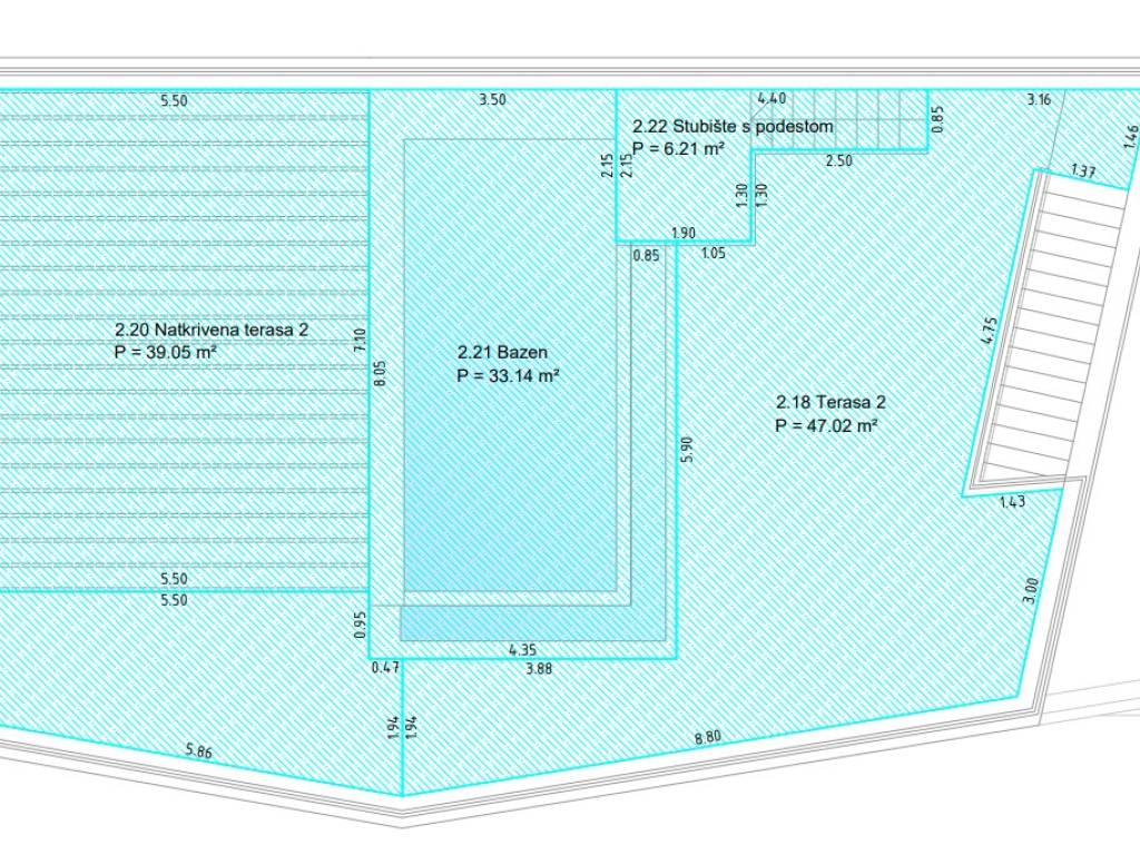 Terraces (47.02 m2 and 86.87 m2), swimming pool (33.14 m2)