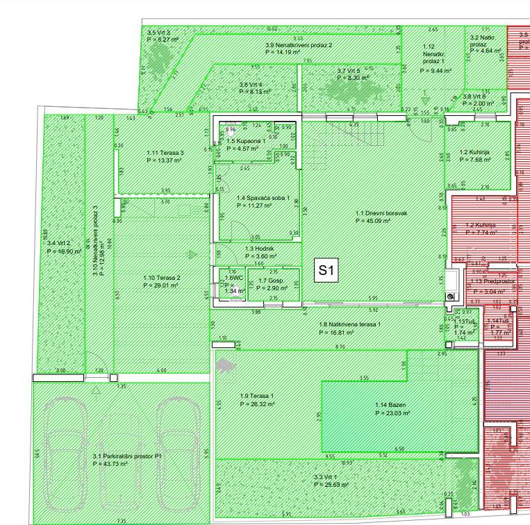 We are selling an apartment in a residential building with a total of three residential units. The apartment has a gross area of ​​417m2 and a net living area of ​​222m2. The apartment is two-story and spreads over two floors, the ground floor and the first floor. On the first floor there is a large common living room with kitchen, pantry, toilet and the first bedroom with a separate bathroom and its own terrace. A large HS portal connects the living area with the plot with two sitting areas, with a summer kitchen with barbecue and sink. From the living room on the ground floor there is an exit to the garden with a swimming pool that has its own filtration and preparation for other facilities (countercurrent, jet, heat pump heating). High-quality DerFall pool foil.