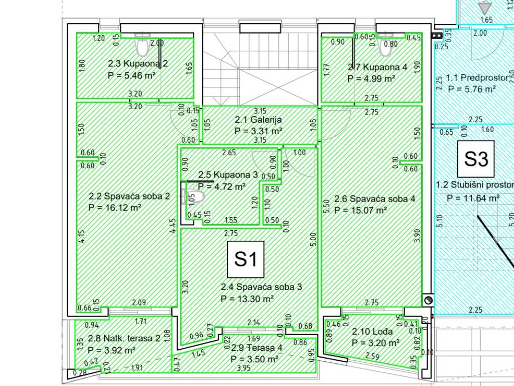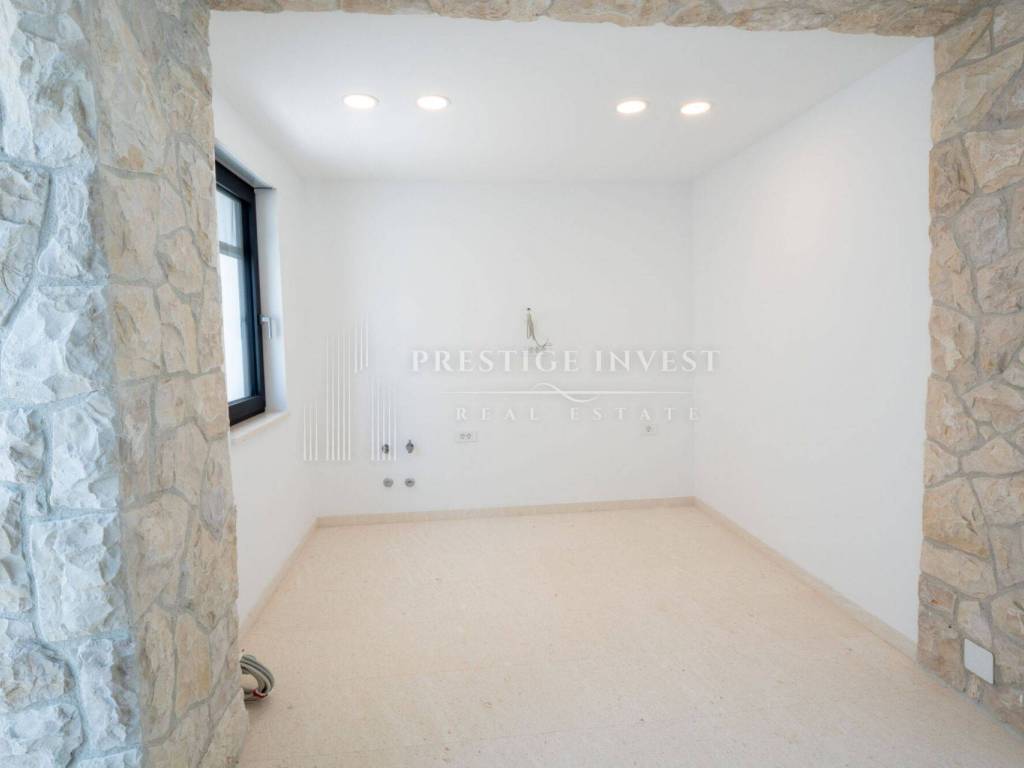 The kitchen corner is designed for a kitchen island, so that connections for hot and cold water, sewage and electricity for cooking are already prepared. Near the living room there is a toilet with a sink, and each bedroom has its own bathroom. The selected tiles are again of high quality from the Italian manufacturer Panaria, sanitary ceramics from the German brand Villeroy & Boch. Yellow Benkovac stone was used in the kitchen and living room. The outdoor areas, and especially the terraces, are covered with white, high-quality Brač stone. Interestingly, the same stone was used to cover the White House in Washington.