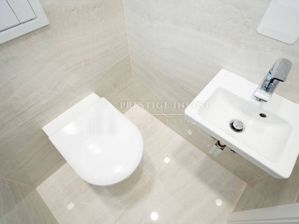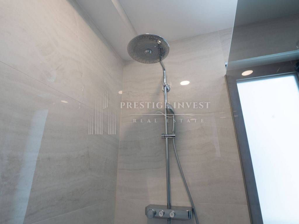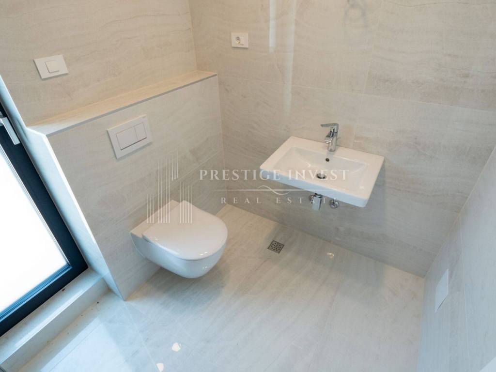 High-quality stone tiles made of local white stone, high-quality interior and floor tiles or Hansgrohe bathroom equipment. The interior door frames are 2.3 m high, the Lignor brand leaves are of higher quality, non-rebated fittings.