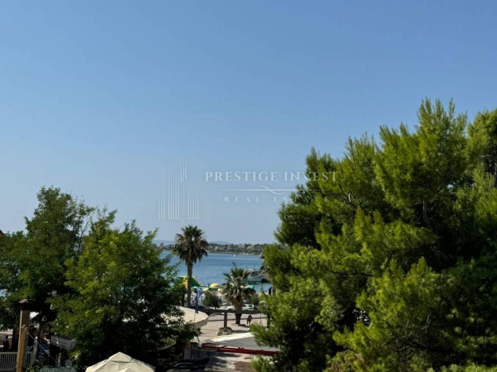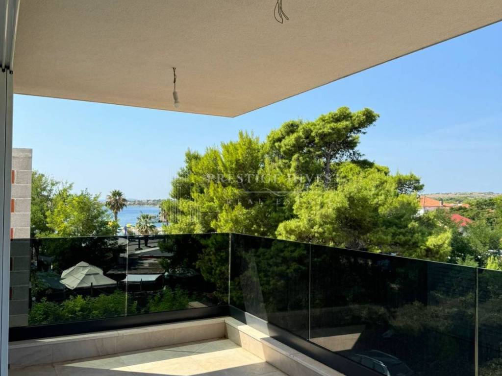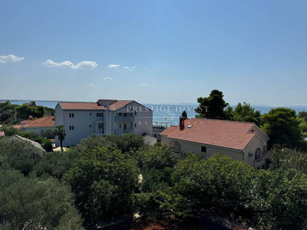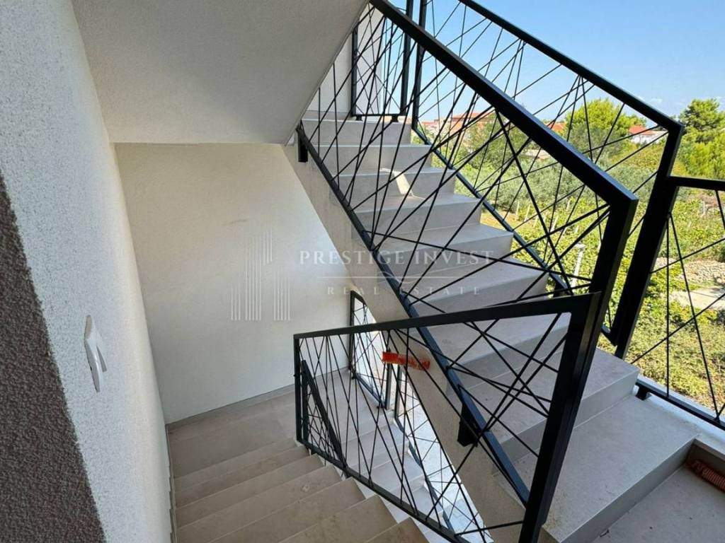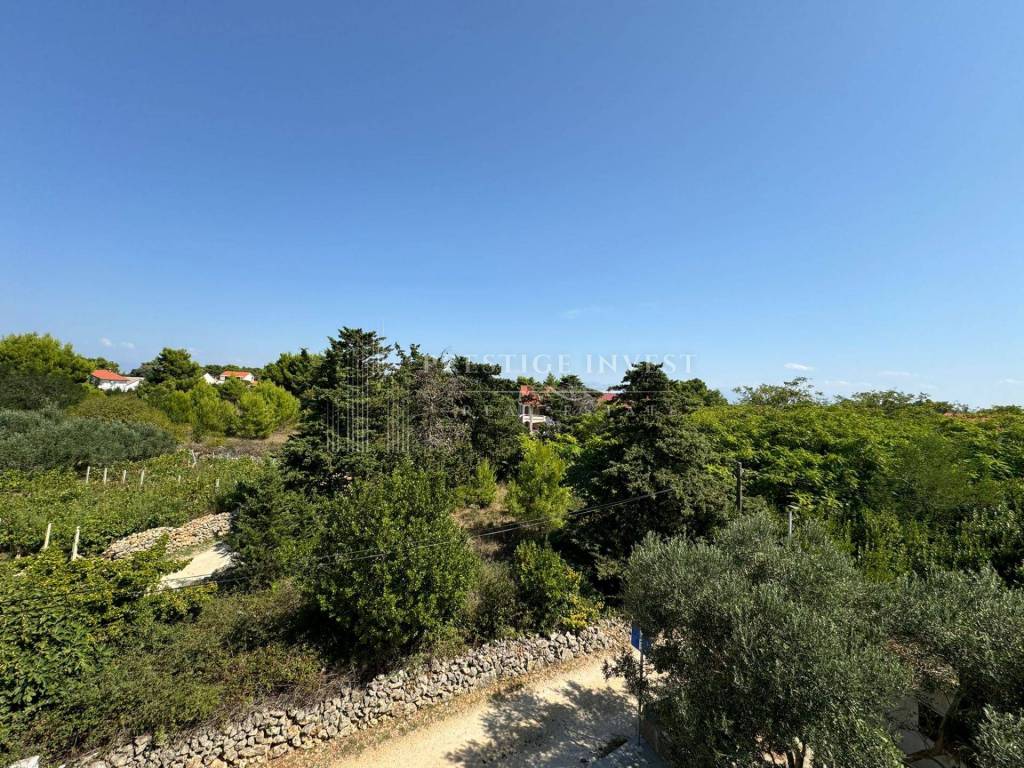 For sale is a luxurious apartment with a roof terrace of 45 m2 in the very center of the island of Vir, only 80 meters from the sea. The apartment is located on the first floor of a residential building that has a total of three residential units. The apartment consists of a spacious living room with kitchen and dining room, two spacious bedrooms, bathroom, storage room, and a covered terrace of 15 m2, as well as a roof terrace of 45 m2. The apartment also has two outdoor parking spaces.