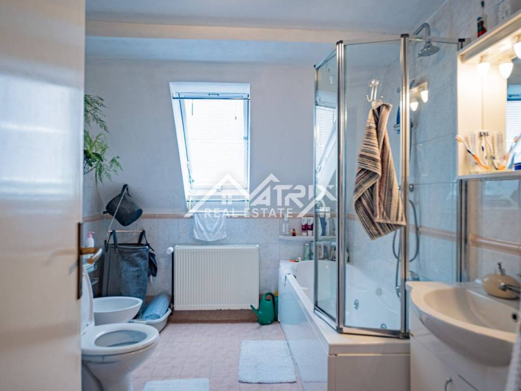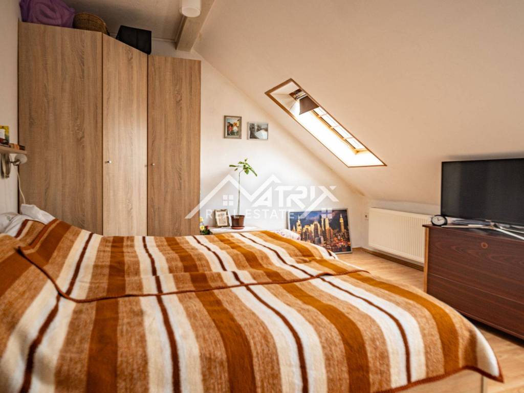 The apartment features an entrance hall, a spacious kitchen with a dining area overlooking greenery, two large bedrooms, an additional living or study room, a bathroom with both a tub and shower, and a separate WC. The attic windows provide a bright and cozy atmosphere throughout the home.
