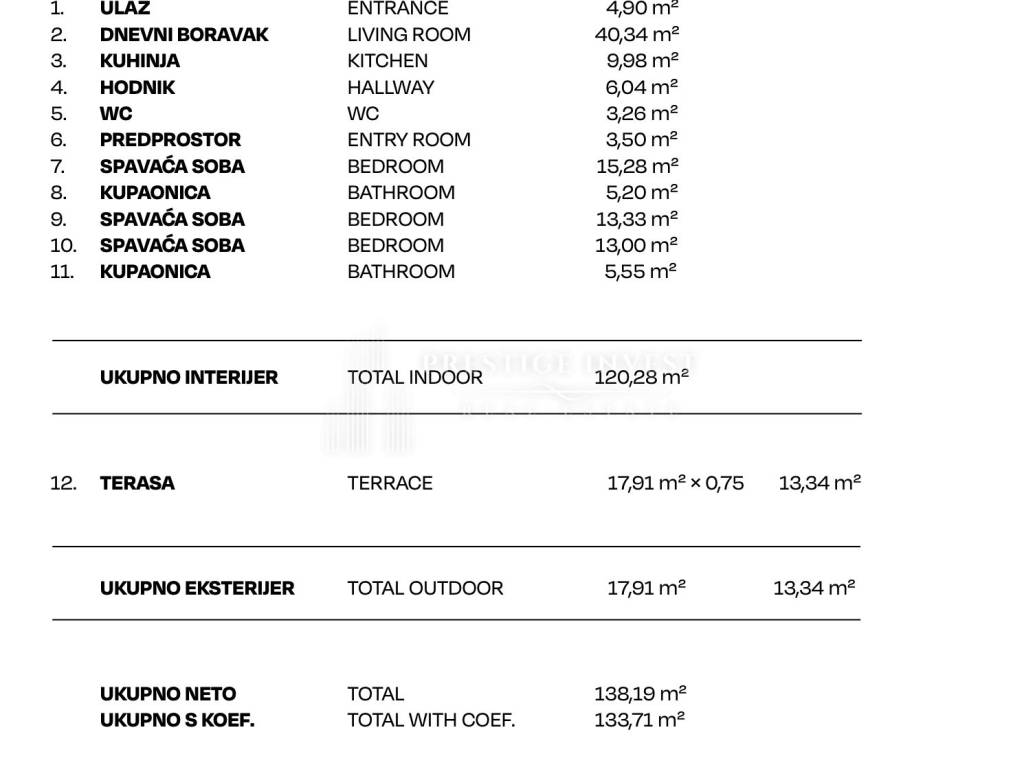ENTRANCE – 4.90 m² LIVING ROOM – 40.34 m² KITCHEN – 9.98 m² HALLWAY – 6.04 m² WC – WC – 3.26 m² ENTRY ROOM – 3.50 m² BEDROOM – 15.28 m² BATHROOM – BATHROOM – 5.20 m² BEDROOM – BEDROOM – 13.33 m² BEDROOM – BEDROOM – 13.00 m² BATHROOM – BATHROOM – 5.55 m² TOTAL INTERIOR – TOTAL INDOOR – 120.28 m² TERRACE – 17.91 m² × 0.75 = 13.34 m² TOTAL OUTDOOR – 17.91 m² / 13.34 m²
