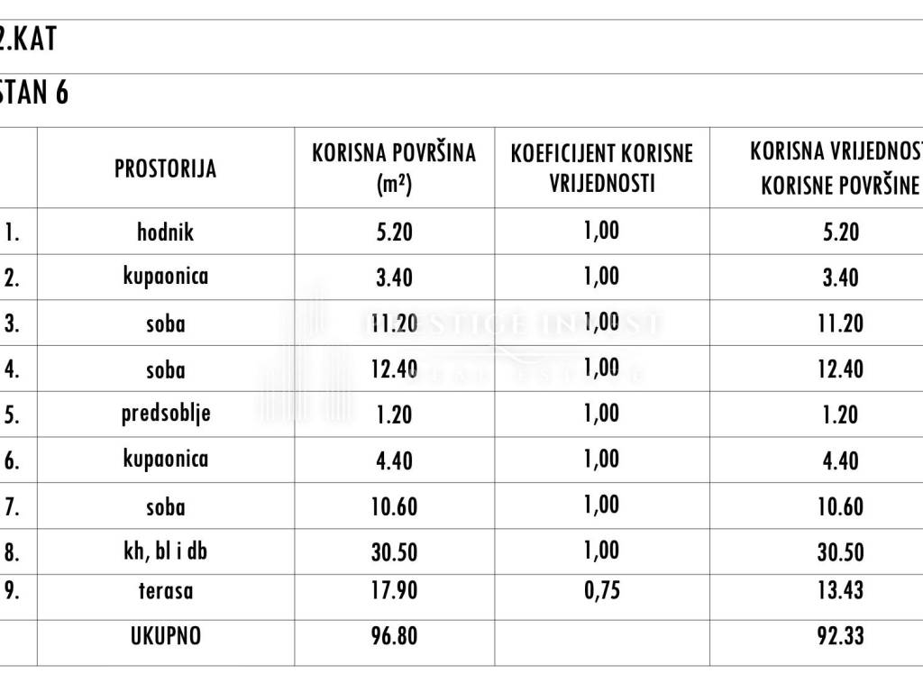 Total usable area of the living area only: 92.33 m² net The apartment consists of: hallway: 5.2 m² bathroom: 3.4 m² rooms: 11.2 m² rooms: 12.4 m² hallway: 1.2 m² bathroom: 4.4 m² rooms: 10.6 m² kitchen, dining room and living room: 30.5 m² terrace: 17.9 m² (calculated 13.43 m²) Total: 96.8 m² gross / 92.33 m² net usable area