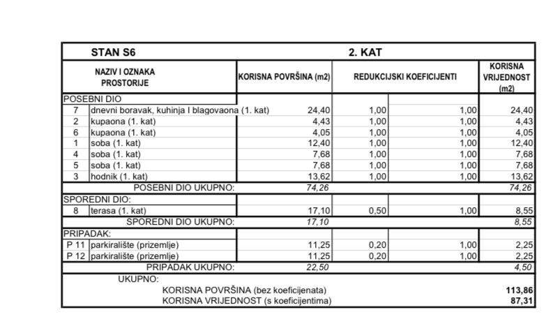 Apartment S6 is for sale, located on the second floor of a modern newly built residential building in the settlement of Srima, near Vodice. The total area of the apartment is 87.31 m² and it consists of a kitchen connected to the dining and living area, a hallway, three bedrooms, two bathrooms, and a covered terrace of 17.10 m² that offers additional comfort and outdoor living space. The apartment includes two private parking spaces marked P11 and P12. The building is being constructed in accordance with the latest construction standards and will be equipped with high-quality PVC joinery, modern ceramic tiles, and top-tier sanitary ware. With the beach only 350 meters away, this location is ideal for year-round living, vacation, or tourist rental. Completion of construction is scheduled for 2026, and the buyer is exempt from paying real estate transfer tax.