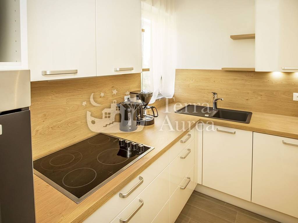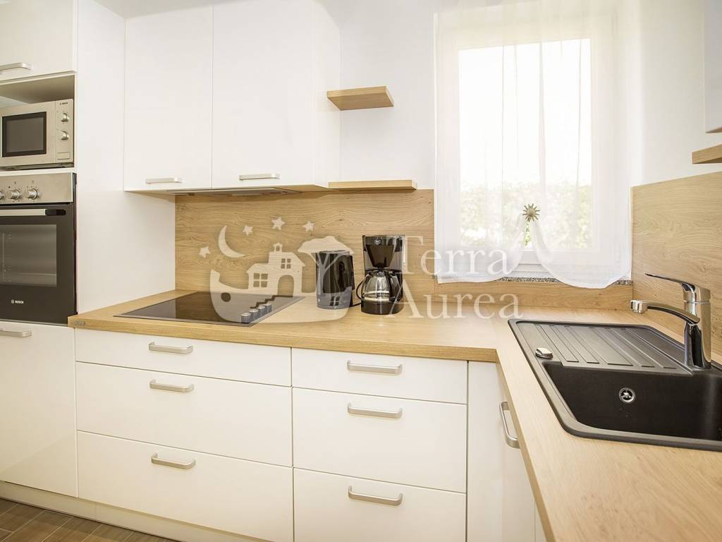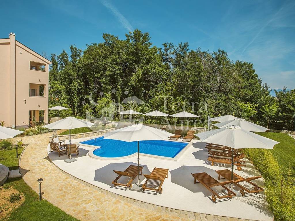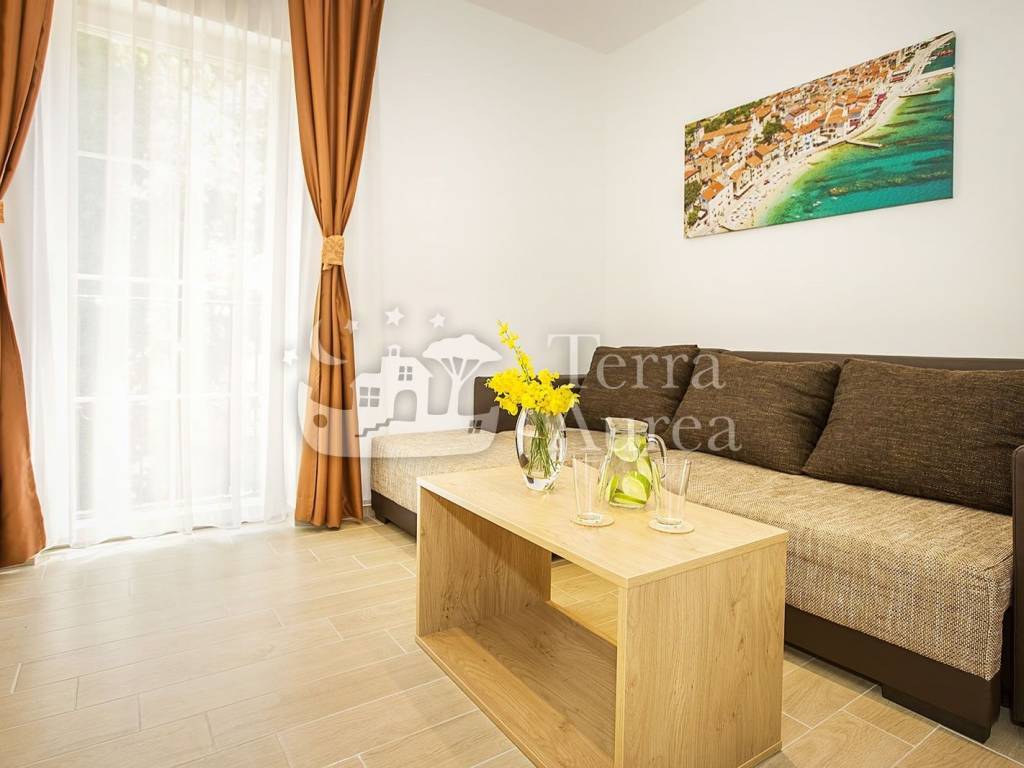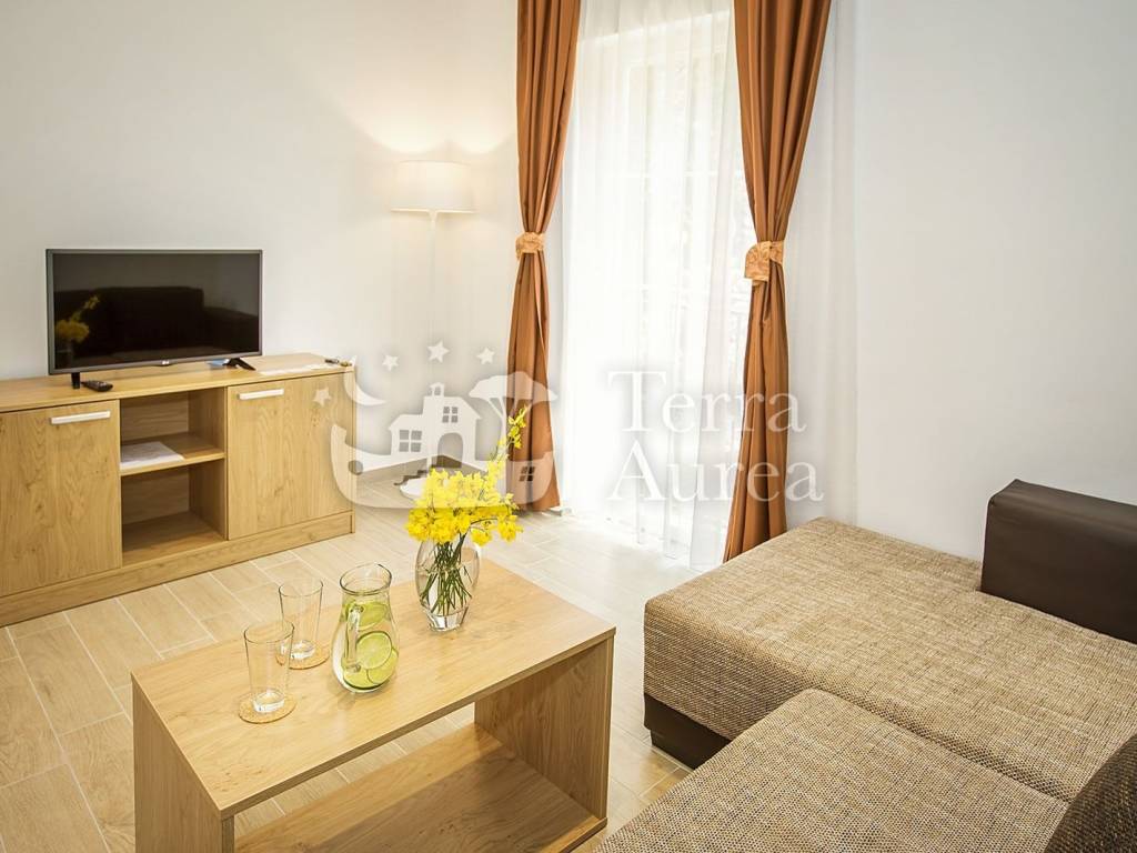 The apartments are modernly equipped, every room is air-conditioned and underfloor heating has been installed. Each apartment has its own terrace or balcony where you can enjoy the rays of the sun and the view of untouched nature every day. The interior design of the property is striking and original, but not intrusive - neutral shades prevail and the decoration itself gives the impression of simplicity and airiness.
