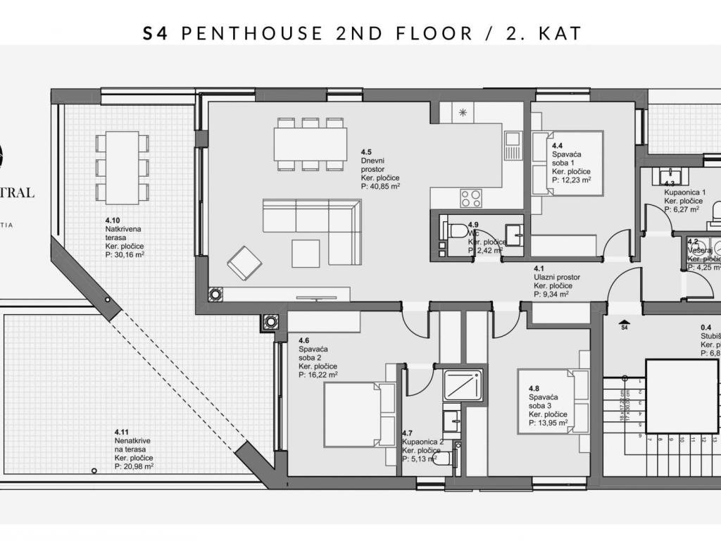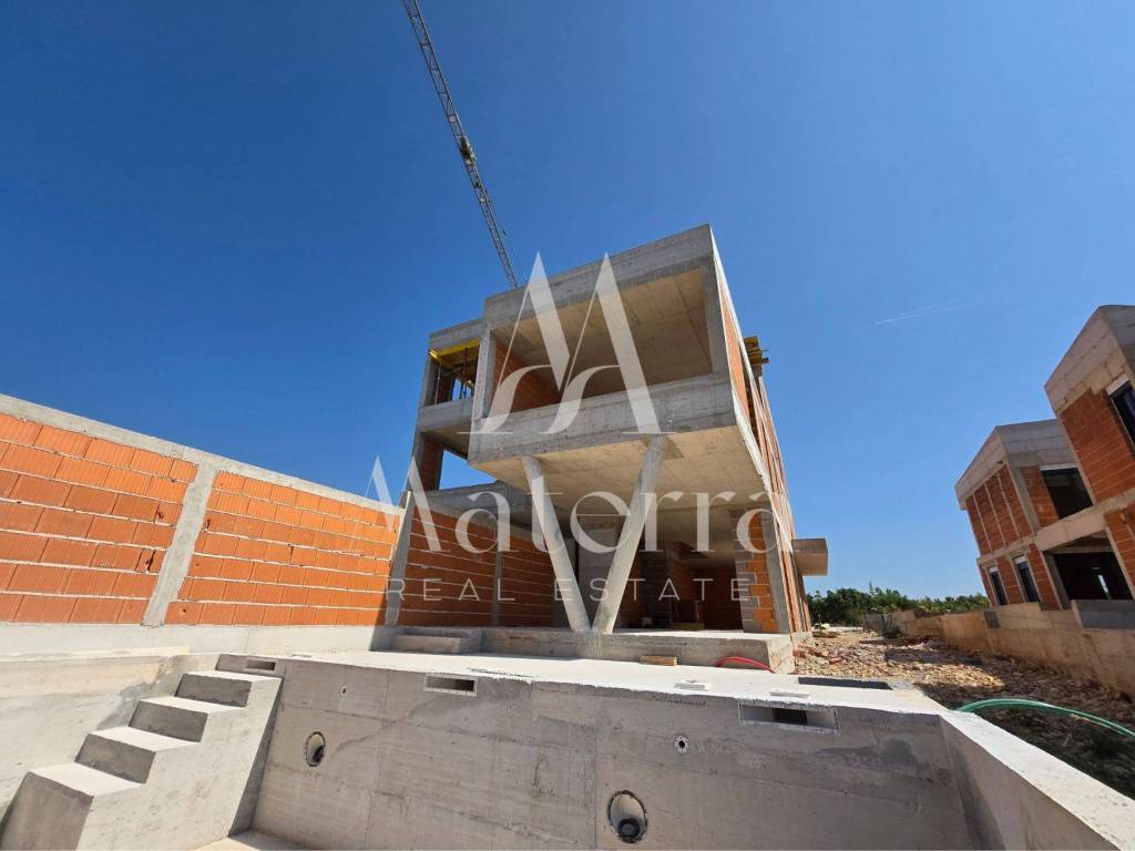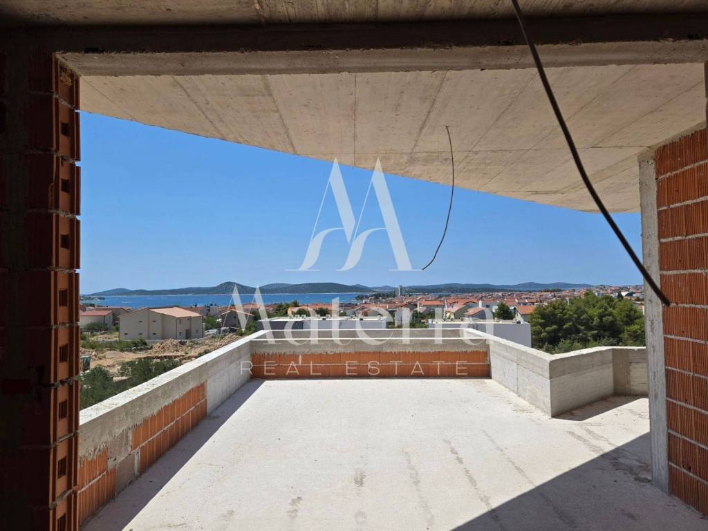 A penthouse occupying the entire second floor of a new residential building is for sale, located in a quiet part of Vodice, approximately 1 km from the beach and town center. The building consists of only four residential units and is being built to high construction standards.