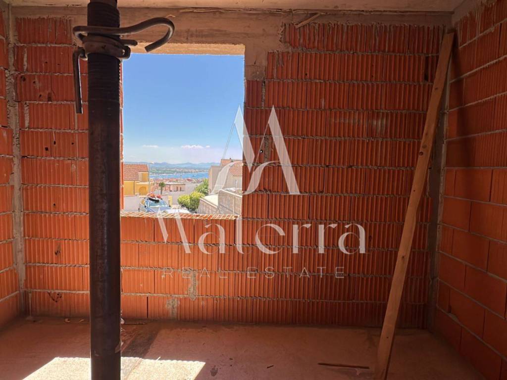 A luxury apartment S1 located on the ground floor of a newly built building in an attractive location in Vodice is for sale. The apartment has a total area of 74.78 m² and consists of a functional living area with a kitchen and dining room, two bedrooms, a bathroom, a WC with a laundry room, a hallway, and a spacious partially covered terrace of 19.71 m². The apartment also comes with a garden area, a storage room in the basement, and a parking space. The building is situated in a peaceful location, only 800 m from the nearest beach and 950 m from the center of Vodice.