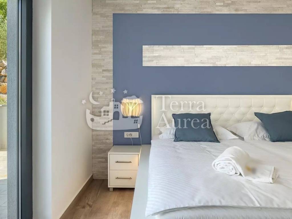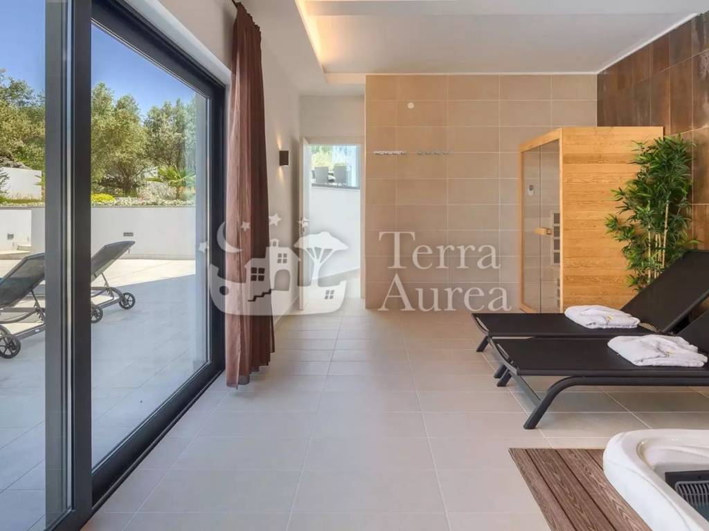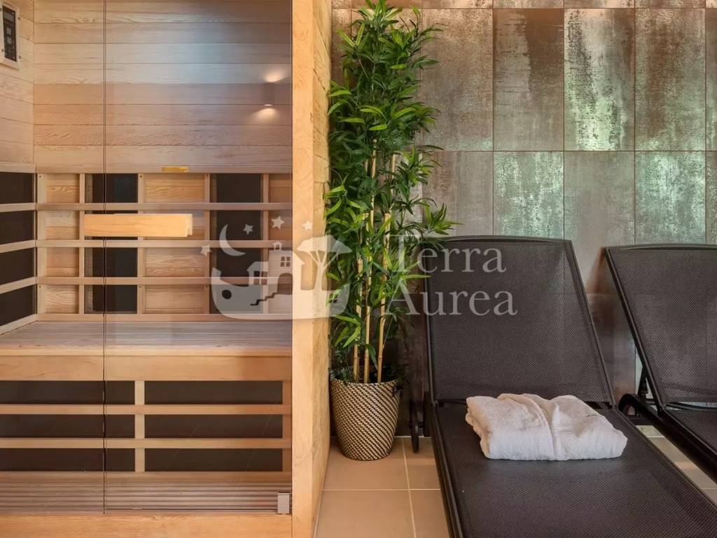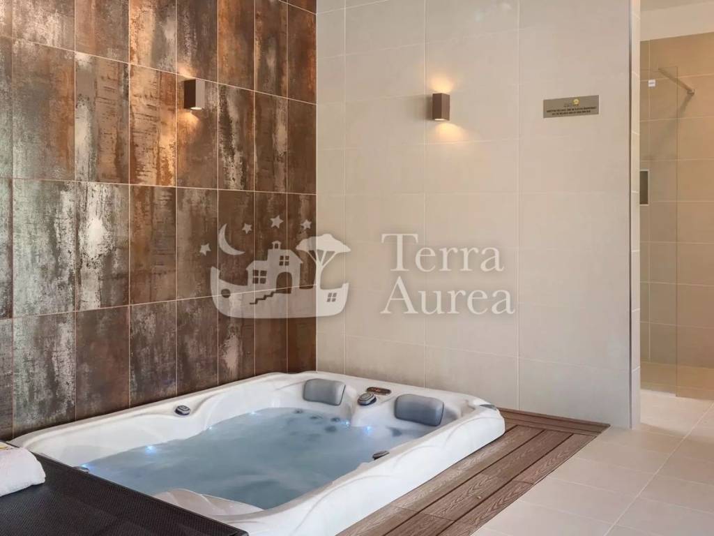 The ground floor of this villa impresses with its space, which includes three spacious bedrooms, two bathrooms, an engine room, a basement and storage areas. The mezzanine floor is reserved for a wellness oasis equipped with a jacuzzi and a small sauna. This space leads to a spacious terrace, ideal for sunbathing, which extends next to the pool with a built-in hydromassage system and a waterfall.