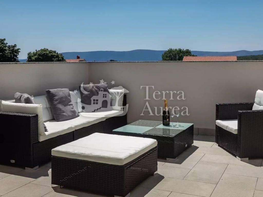 On the first floor there is a spacious living room, a modern kitchen with a dining room, a small bathroom and a partially covered terrace. The roof terrace, which is decorated with ceramics and a fence, is a perfect sunbathing area with a fascinating view of the Kvarner Bay, offering an incredible landscape towards the city of Rijeka and the island of Cres.