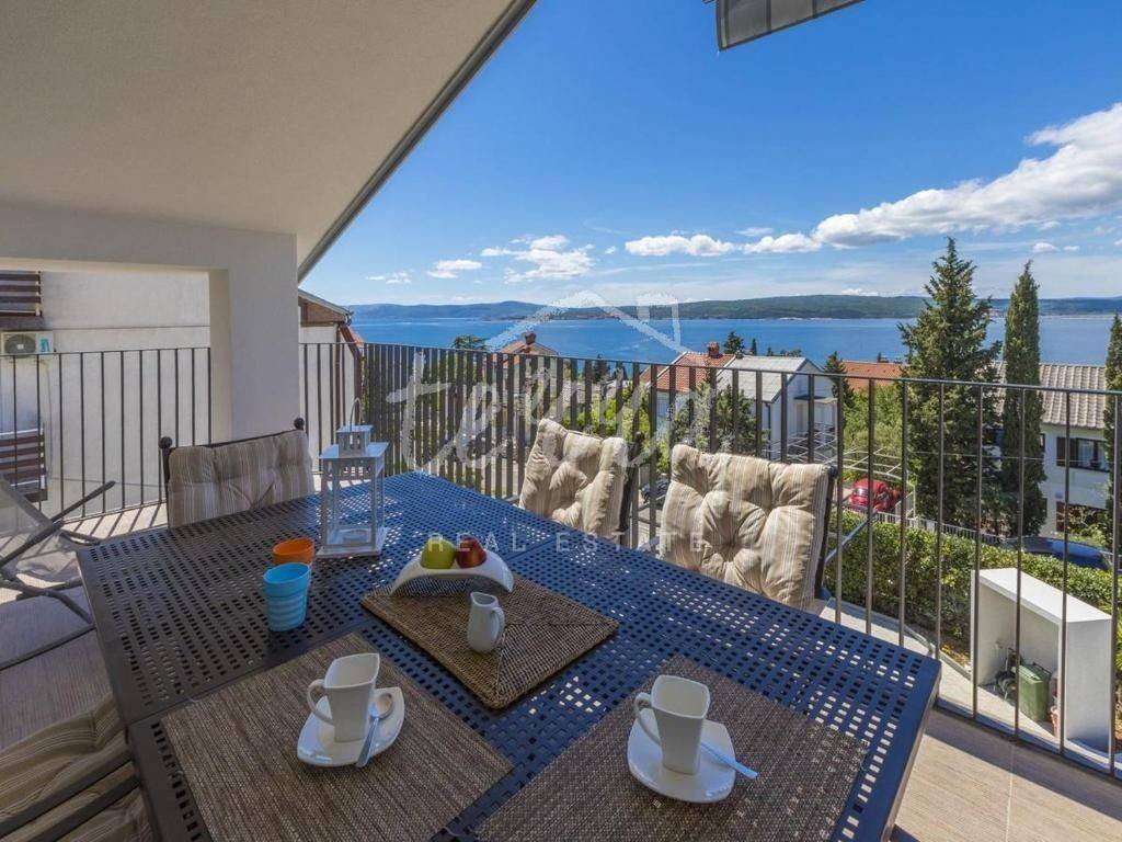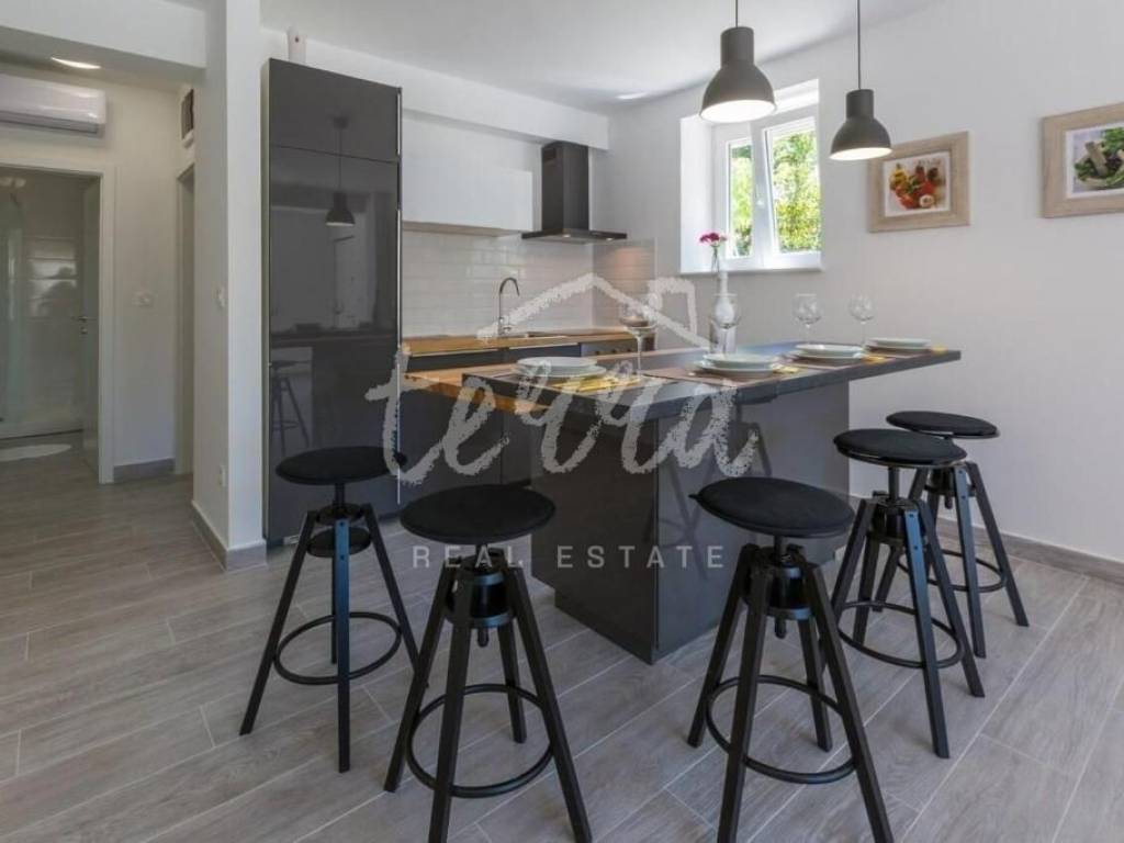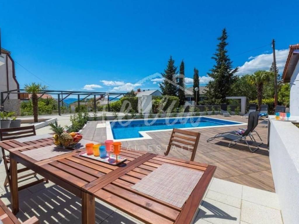 In Dramalj - Crikvenica, there is a beautiful, completely renovated detached house with a living area of 375m2 and a large garden. The house has a floor plan of 12.5x10 and consists of four apartments and a separate building in the yard behind the house. There are two apartments on the ground floor. The smaller apartment is 37m2 + 3m2 terrace, while the area of the larger apartment on the ground floor is 44m2 + 10m2 terrace. On the first floor there is an apartment of 75 m2 + 25 m2 terrace, while on the second floor there is an apartment of the same area as on the first floor and a small storage room of 1.5 m2. In the yard there is a separate building with a terrace of 30 m2. There is also a covered parking lot in the yard where you can park five vehicles and a wonderful swimming pool of 32 m2. All installations (water, electricity, sewerage) were renewed on the building, new exterior PVC joinery and interior joinery was installed. The house also has new floors, bathrooms, while on the outside there is a new facade, roof and new patio paving. The entrances to the apartments are equipped with security doors, preparations have been made for an alarm system, and every room in the house has air conditioning. The house is sold fully furnished with all furniture. Considering the location and arrangement, the facility is certainly a good opportunity for investment and tourism, it is categorized with 4* and can get 5* and on the Booking.com page it is rated with a rating of 9.6 (exceptional). A good microlocation and a wonderful view, and all of the above are the reasons why this property deserves your attention.