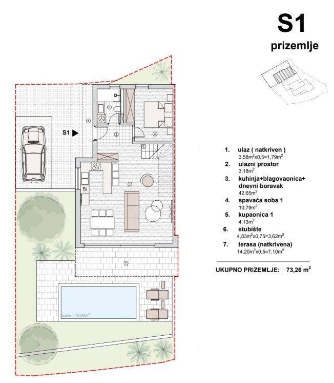 Construction of a modern residential building with three terraced units will begin in winter 2026. The property is located in a new residential area of Vodice, in a quiet location, 800 m from the beach and 1,200 m from the town center.