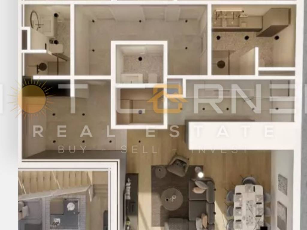 The subject apartment of 130 m2 is located on the 2nd floor of a multi-apartment building with a total of 30 apartments and consists of a hallway, kitchen, living room and dining room, 3 bedrooms, 2 bathrooms, an additional toilet, and a loggia.