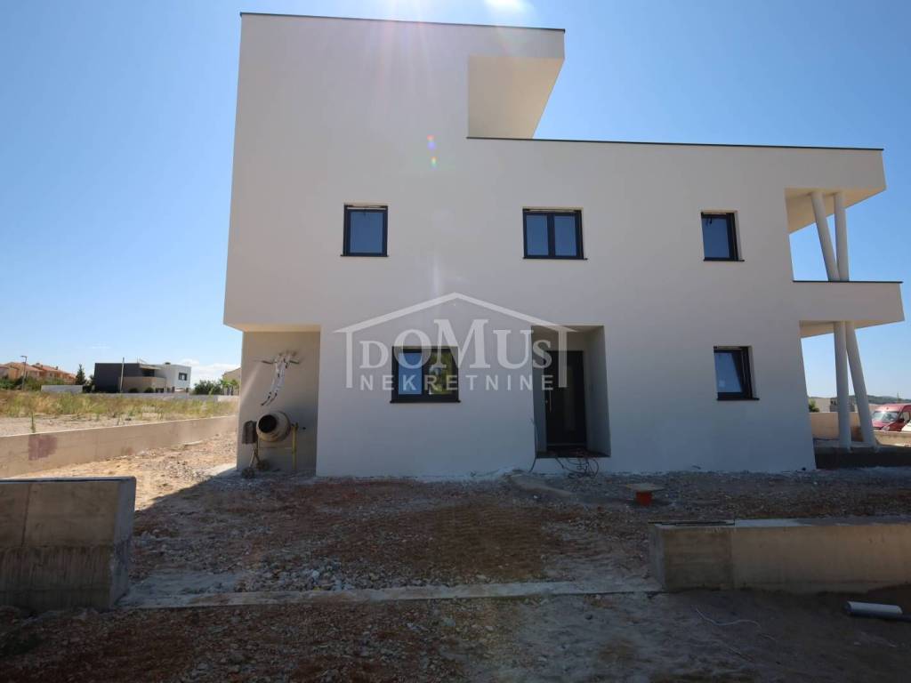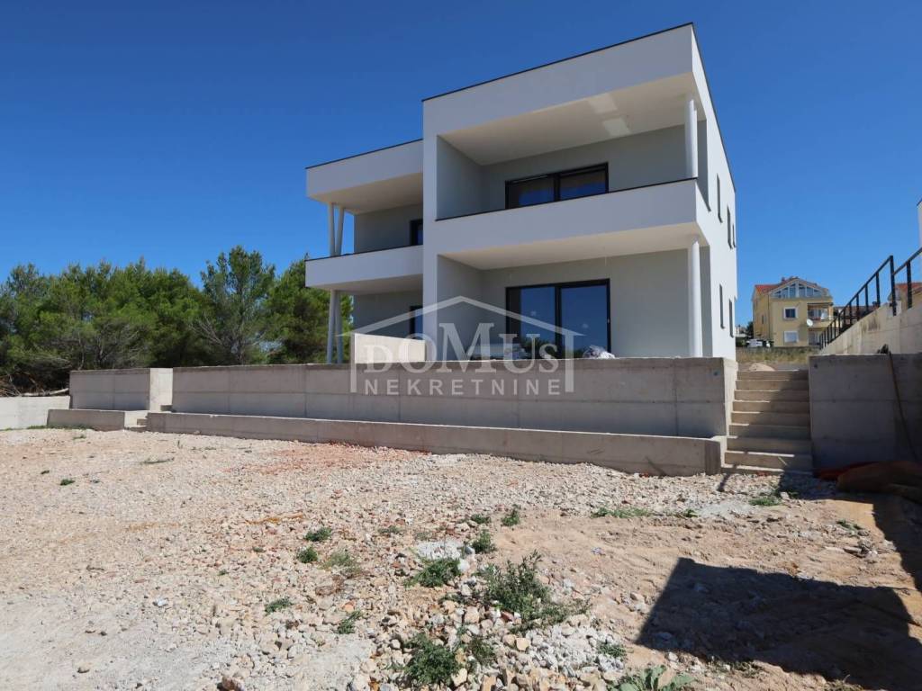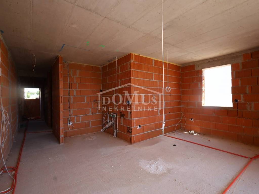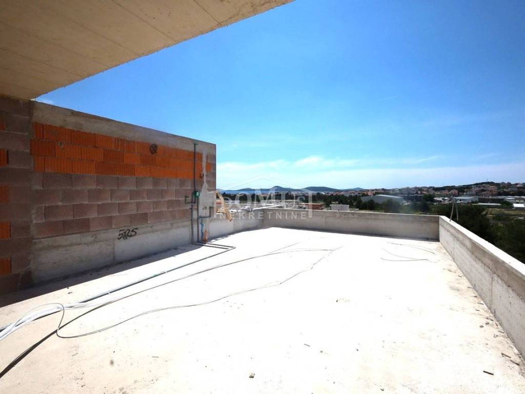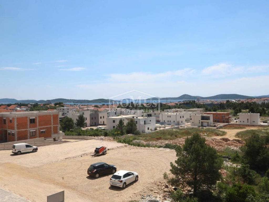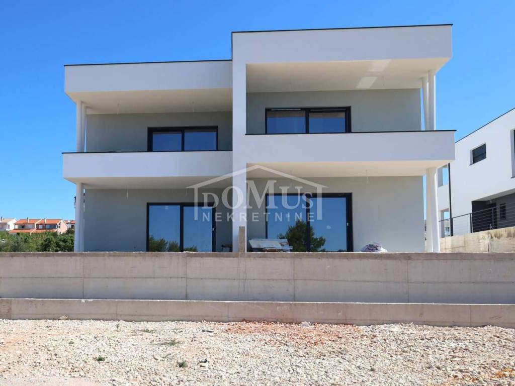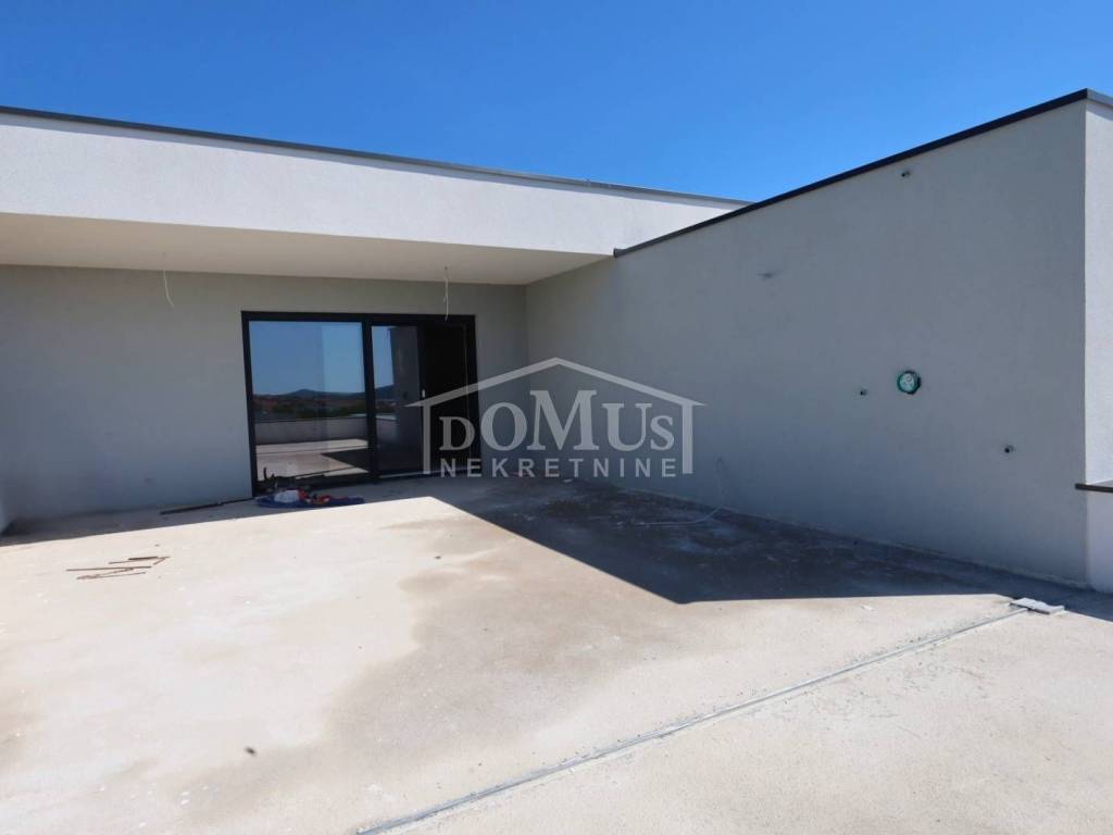 Newly built, in a quiet location, there is a comfortable two-bedroom apartment with a roof terrace with a sea view and parking. The apartment is located in a small residential building with a total of 4 apartments. It has a modern design and functional layout with a total of 110.31m2 of usable area, and consists of two bedrooms, a bathroom, a hallway and a spacious kitchen with a dining area and living room as a whole, from which there is an exit to a covered terrace of 12.25 m2. Internal stairs lead to the 2nd floor where there is a roof terrace of 52.35m2 and a summer kitchen with a toilet. The apartment is equipped with air conditioning (bedrooms and living room), underfloor water heating throughout the apartment, an electric stove "Valiant", PVC joinery with mosquito nets, security entrance doors, and high-quality ceramics and sanitary ware. The apartment has a parking space of 12.50m2. The apartment is located 2000m from the beach, and 1600m from the center.