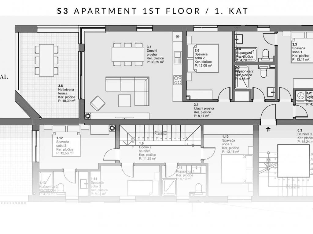 Luxury apartment S3 with a spacious terrace and a view of the sea, located in a smaller building with a total of four residential units. The apartment is located on the first floor and offers a perfect combination of modern design, top quality and comfort. The total net usable area is 97.89 m², and an additional value is provided by the covered terrace that allows you to enjoy the sea view. The apartment comes with two parking spaces.